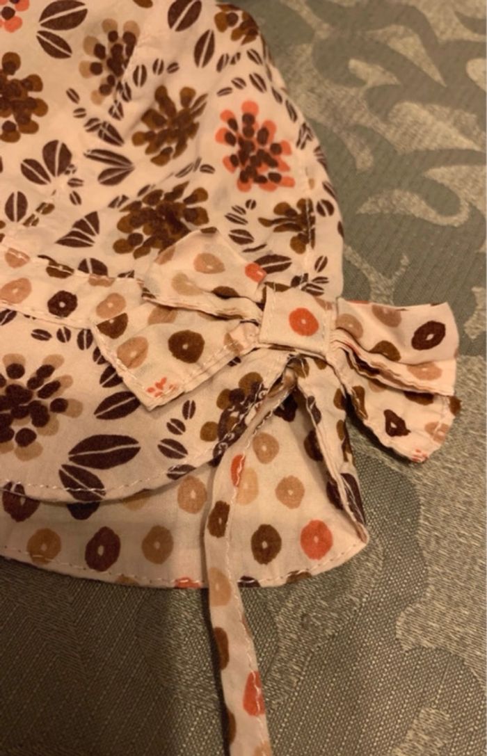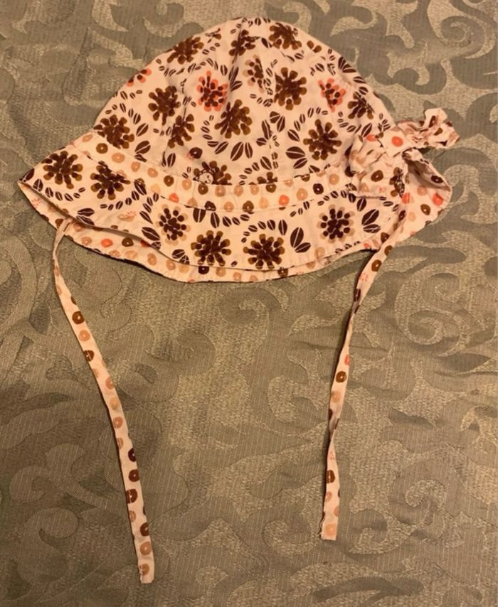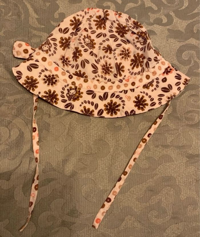 Adorable chapeau de soleil pour bébé de la marque Sergent Major, parfait pour l’été. Motif floral élégant en tons beige, marron et touches d’orange sur fond clair, style bucket hat avec bord large pour une bonne protection UV.[Pièce jointe +1] Taille 45 (correspond à environ 6-9 mois, circonférence tête ~45 cm). Équipé de liens sous le menton réglables pour un maintien sécurisé.
