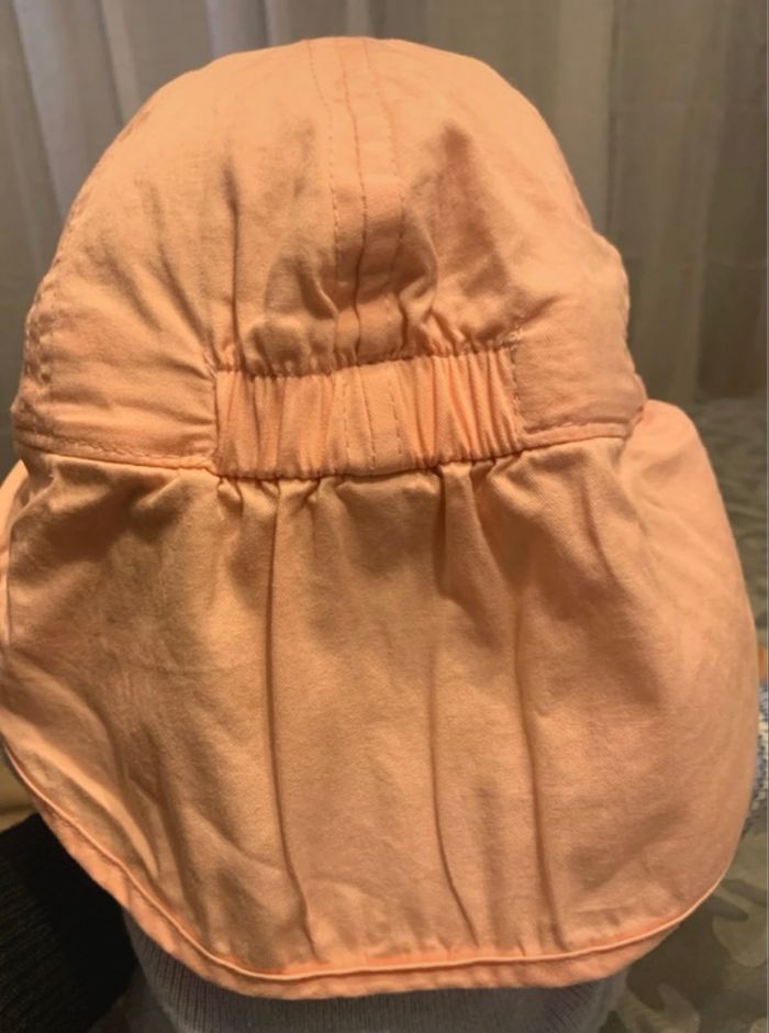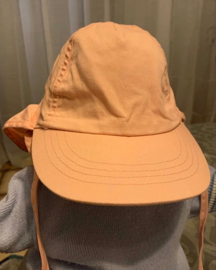 Adorable chapeau de soleil pour bébé, taille 6-12 mois (47 cm environ), parfait pour protéger du soleil grâce à son large rabat couvrant les oreilles et la nuque. Fabriqué en 100% coton doux et respirant, idéal pour les journées ensoleillées ou à la plage. Couleur beige/orange clair très mignonne, style bucket hat avec visière et lien sous le menton pour un maintien optimal. Parfait pour l’été ou les vacances , porté quelques fois, propre et sans accrocs ni taches visibles.