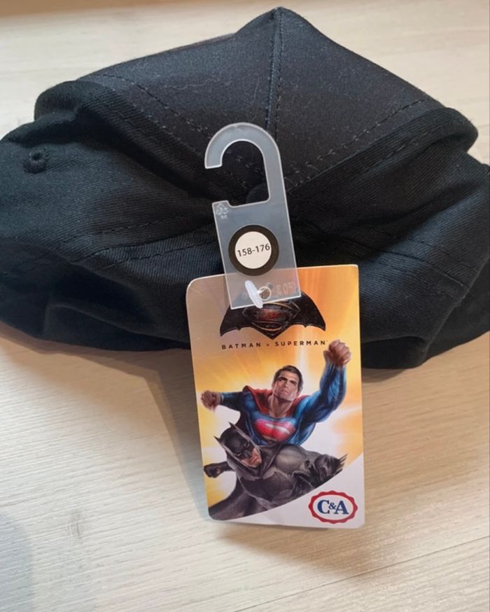 Vends casquette snapback noire officielle C&A DC Comics Batman v Superman, neuve avec étiquette. Design iconique avec logo Batman en impression all-over sur le devant et “Batman & Superman” en bas, idéale pour les fans de super-héros. Casquette snapback ajustable pour enfants, taille 118-176 cm (environ 4-8 ans, tour de tête 52-56 cm). Tissu noir résistant, visière plate, intérieur renforcé blanc pour un confort optimal, étiquette C&A intacte. Logo Batman luminescent avec effets sombres, dos pratique avec lacet de serrage. État et Authenticité Neuve, jamais portée, encore sur son cintre de présentation.