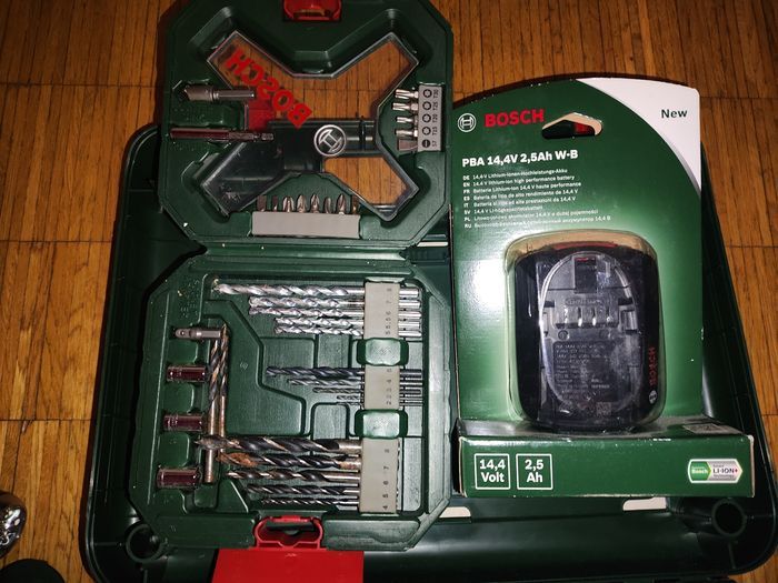 Lot Bosch - 2 batteries Li-ion PBA, Chargeur AL 1830 CV, Lampe de Travail Led, Forets Embouts Cutter, 2 Adaptateurs USB PAA, Perceuse Visseuse sans Fil PSR 14,4 li-2 - photo numéro 1