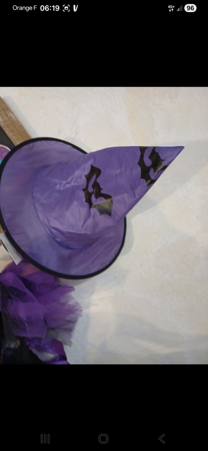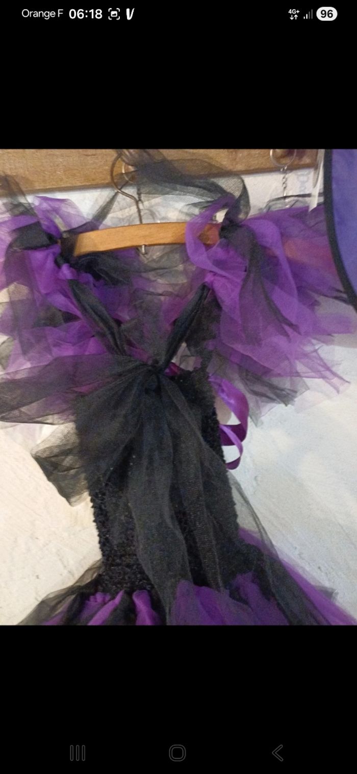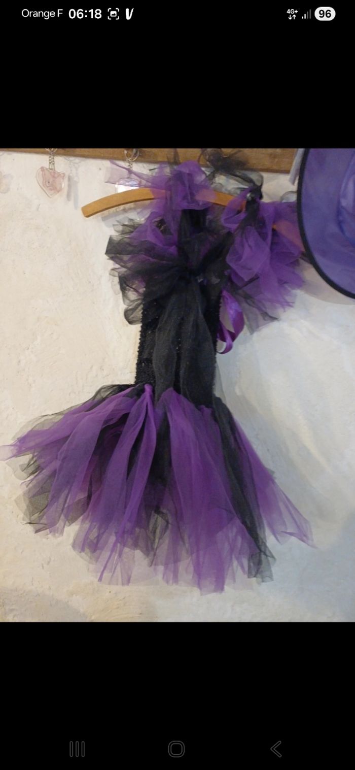 Déguisement de sorcière avec une jolie robe en tulle et ruban pour resserrer. Avec chapeau assorti ( attention decousu au niveau de la couture