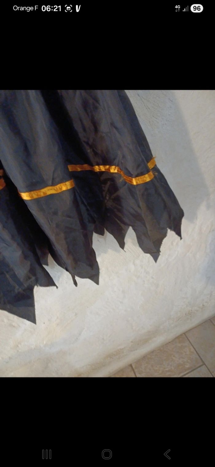 Déguisement de sorcière comprenant une robe avec fermeture par scratchs à l arrière. Elle est un peu abîmée à certains endroits. Avec chapeau assorti ( avec une tâche, voir photo )