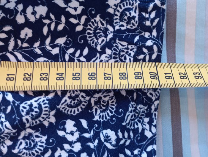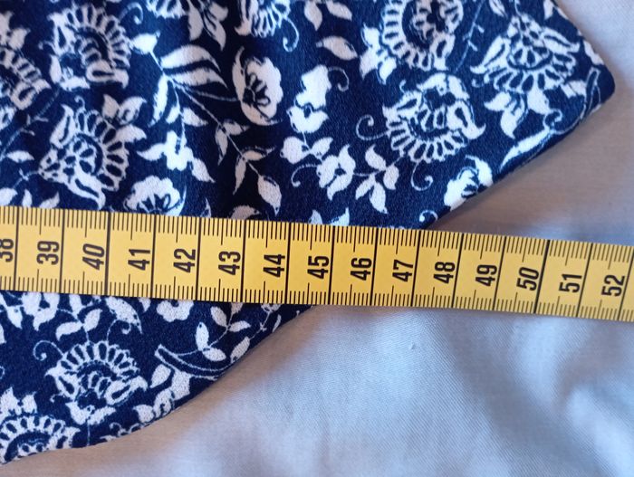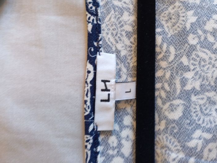 Robe Blanche et Bleu Marque : LH (La Hall) Taille : L / 40 Hauteur : 90cm (Sous genou pour 1m65) Epaule : 45cm Coupe évasée et smockée sous poitrine Col en V Manches courtes Tissu principal : 100% Viscose Doublure : 100% Coton Une question ? N'hésitez pas !