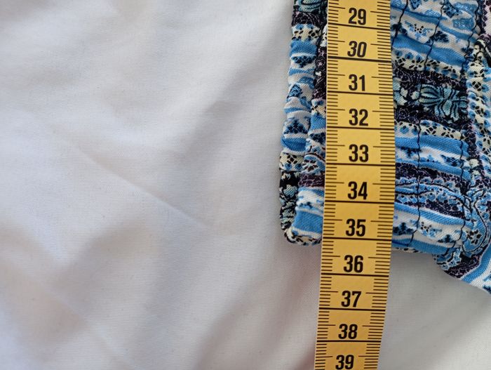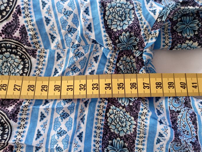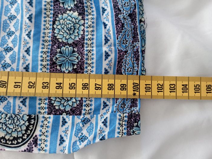 Pantalon fluide type Wax pour femme Taille Smoke élastiquée extensible Couleur principale : bleu ciel Imprimé ethnique afro Taille : XL / XXL (40/42) Coupe : Régular large Matière : 100% Coton Poches sur les côtés Ceinture taille élastiquée Faux cordon rosette à la taille Léger et fluide Jamais porté A - Mesure ceinture taille : 35 cm B - Mesure hauteur : 100 cm C - Mesure longueur jambe : 70 cm D - Mesure bas ourlet : 18 cm E - Mesure cuisse : 31 cm F - Mesure entrejambe : 38 cm Vous avez une question ? Besoin d'informations supplémentaires, N'hésitez pas ! Offre sérieuse acceptée