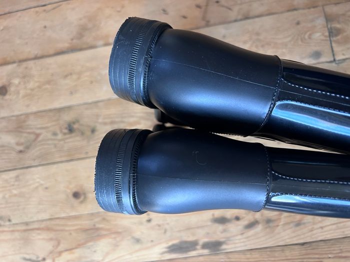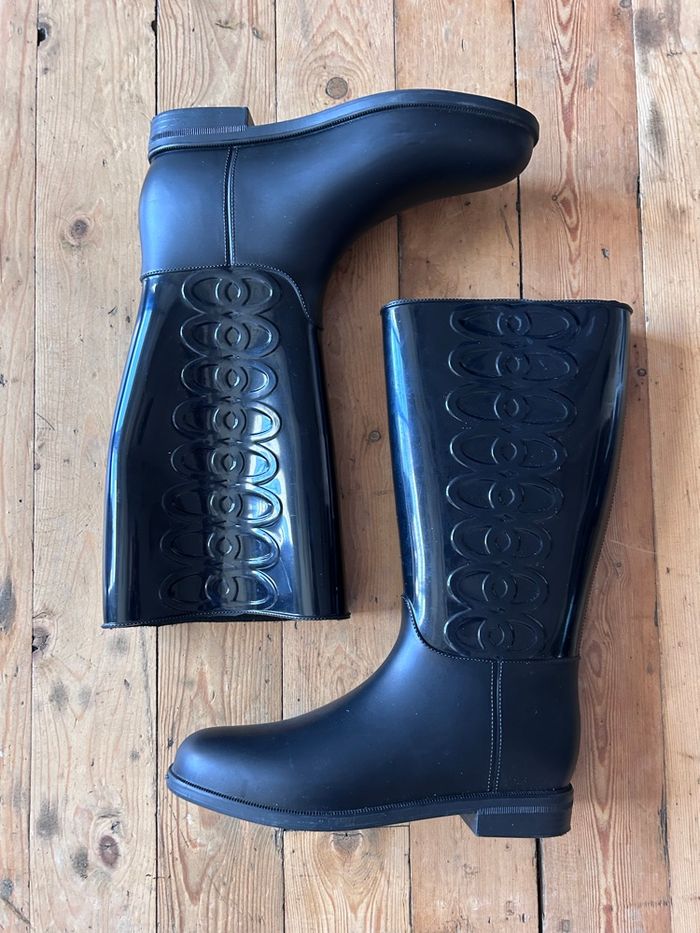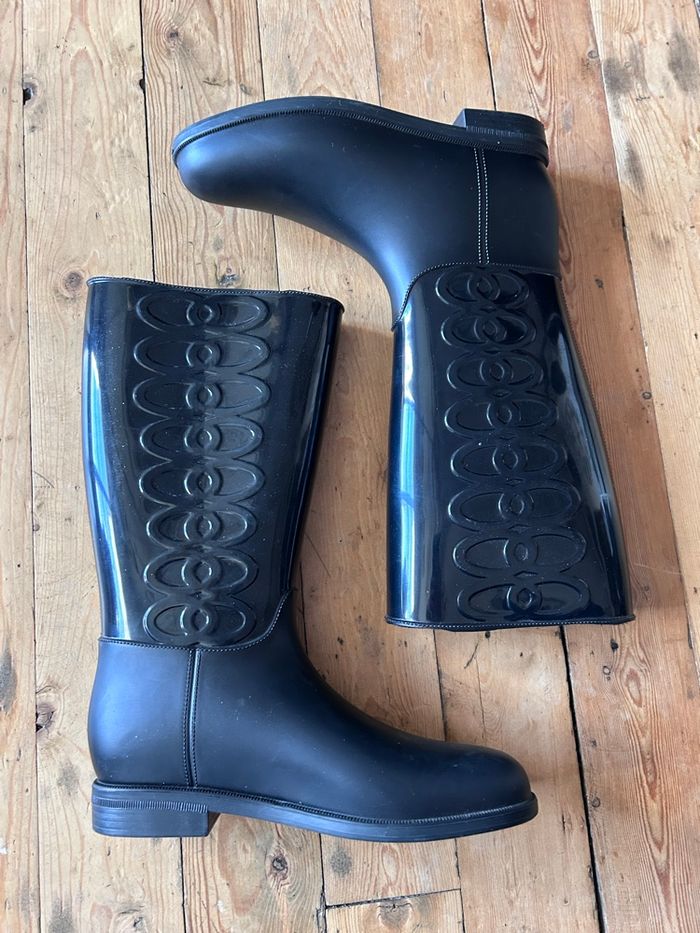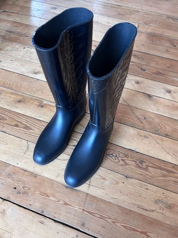 Bottes de pluie style cavalière en caoutchouc noir, coupées en haut car elles étaient trop haute et gênaient derrière le genou Pointure 39 mais pointent assez grand donc plutôt 40 made in Italy Hauteur talon compris 35,5 cm Longueur dessous (semelle ) 27,1 cm