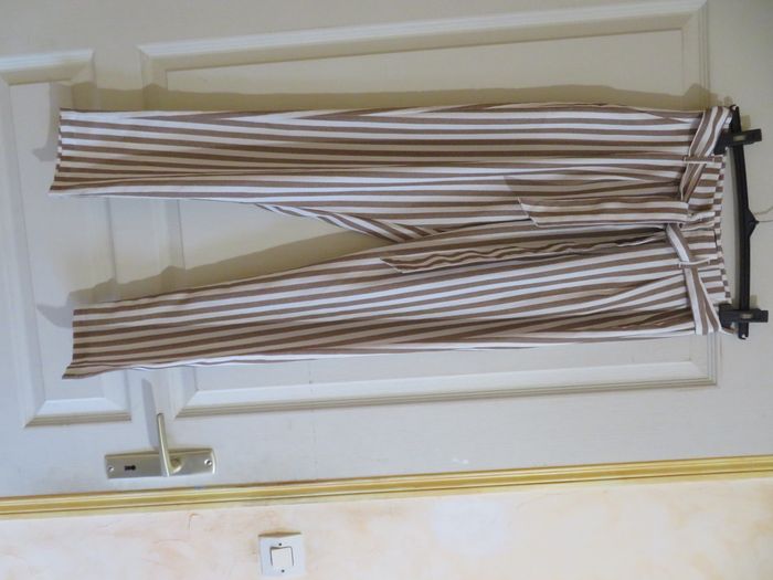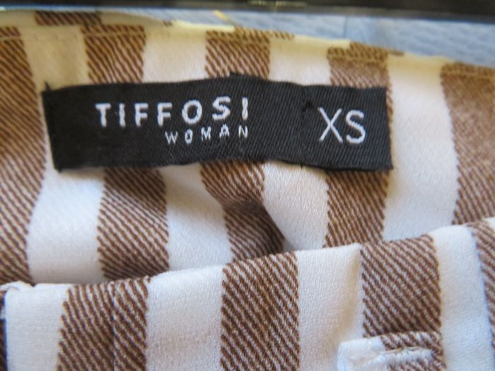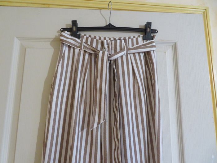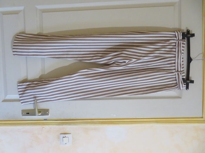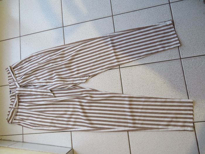 Très chic pantalon rayé, longue ceinture, fermeture par zip + crochet, 2 pinces sur le devant, 2 poches sur les côtés, très élégant, état impeccable, tissu très agréable, taille XS, marque Tiffosi