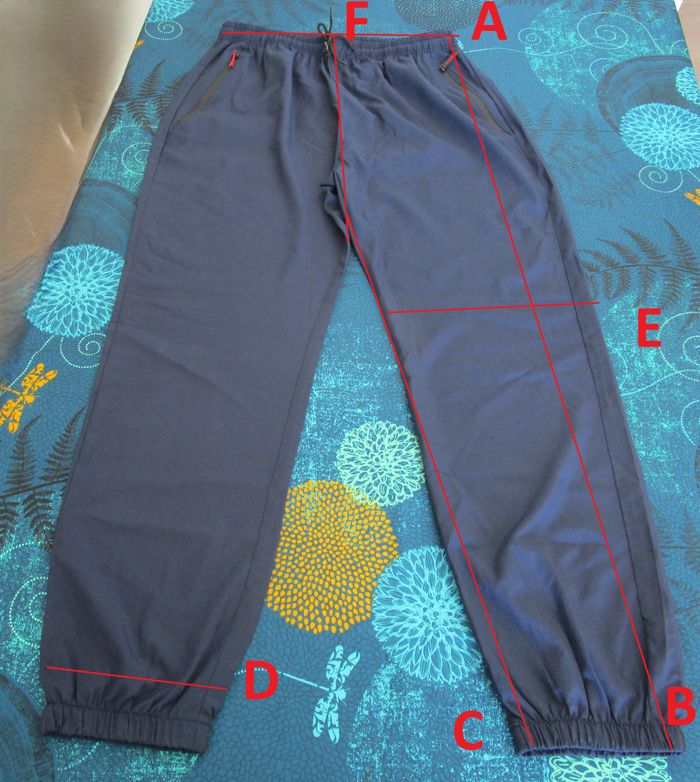 ⭐⭐Offre sérieuse acceptée⭐⭐ Sexe : Unisexe Couleur principale : Bleu Marine Taille : XL Coupe : Régular Matière : 95% Polyester - 5% Elasthanne Poches sur les côtés zippées Ceinture taille élastiquée Cordon de serrage 📏Mesures (voir photo 3)📏: A - Mesure ceinture taille : 42 cm B - Mesure hauteur : 105 cm C - Mesure longueur jambe : 74 cm D - Mesure largeur bas : 19 cm E - Mesure cuisse : 30 cm F - Mesure entre-jambe : 37 cm ℹ️ Vous avez une question ? Besoin de plus d’informations ? N’hésitez pas à m’envoyer un petit message