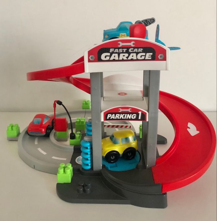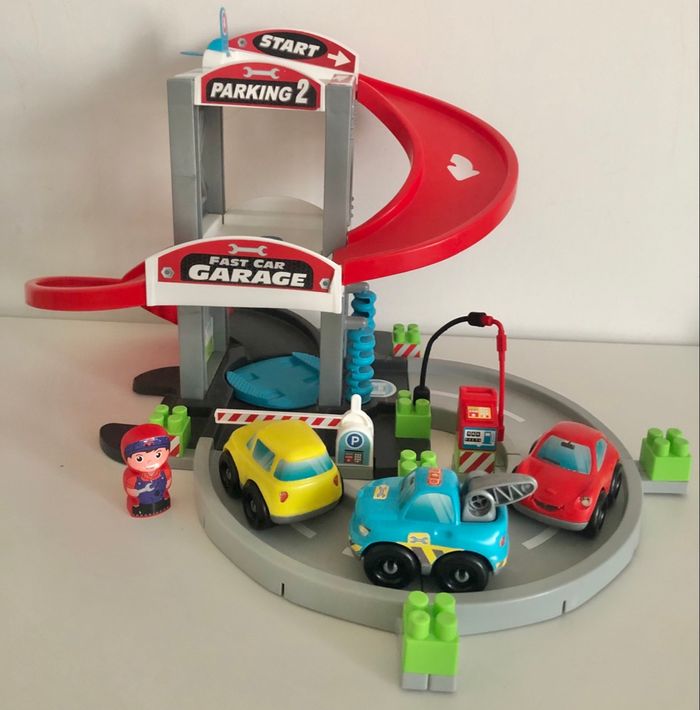 Je vends un garage à étages avec 3 véhicules et une figurine. En très bon état exceptées les étiquettes qui ne sont pas en parfait état et il manque le crochet sur la dépanneuse.