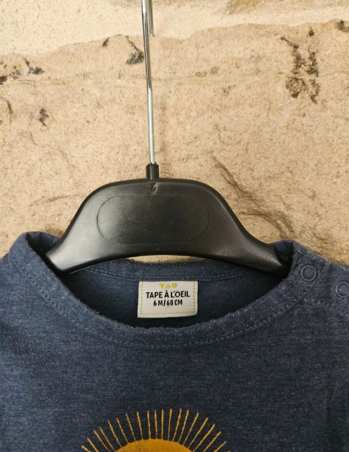 Tee-shirt garçon manches longues, marque Tape à l'oeil, taille 6 mois, bon état ( trace d'usure au niveau du flocage).