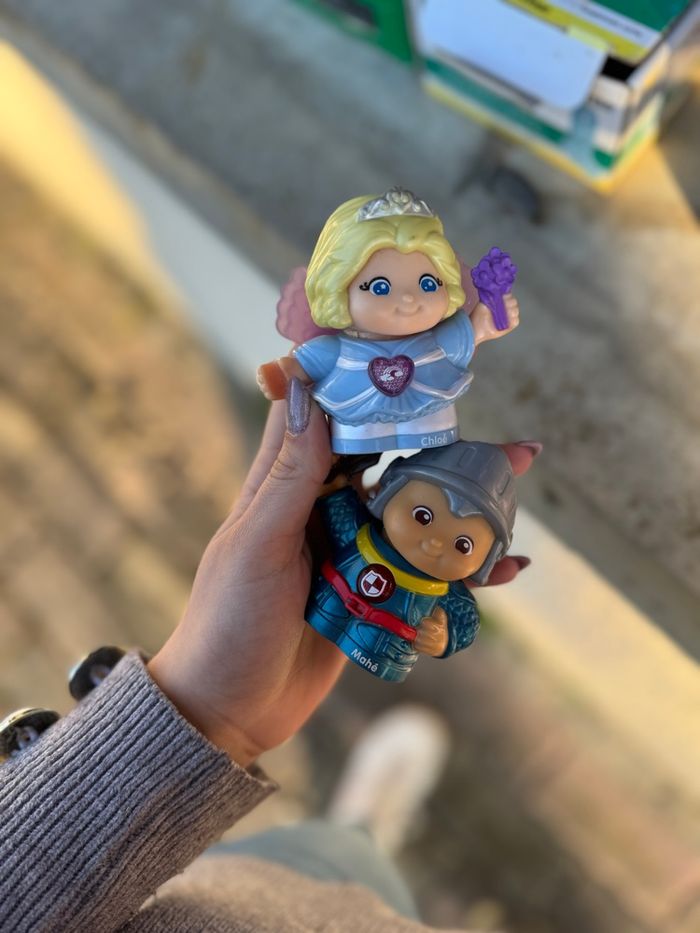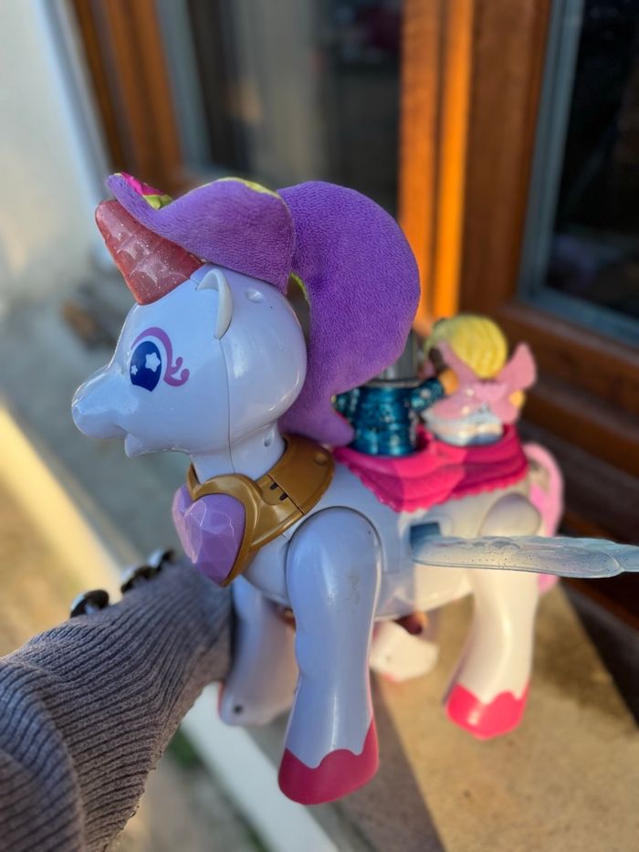 Jeu licorne avec les deux figurines qui parlent et chantent, la licorne elle marche fait de la musique et bas aussi des ailes 🪽 En très bon état 😍 Vendu avec piles !