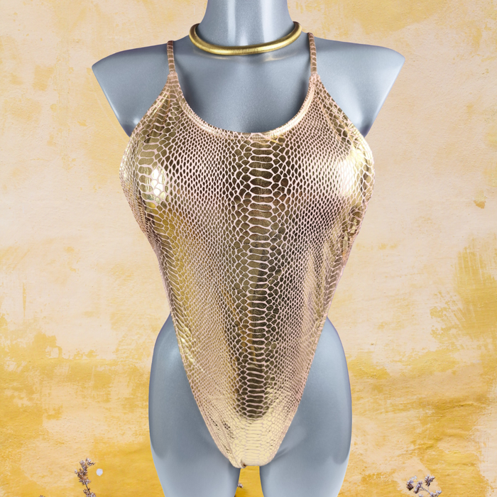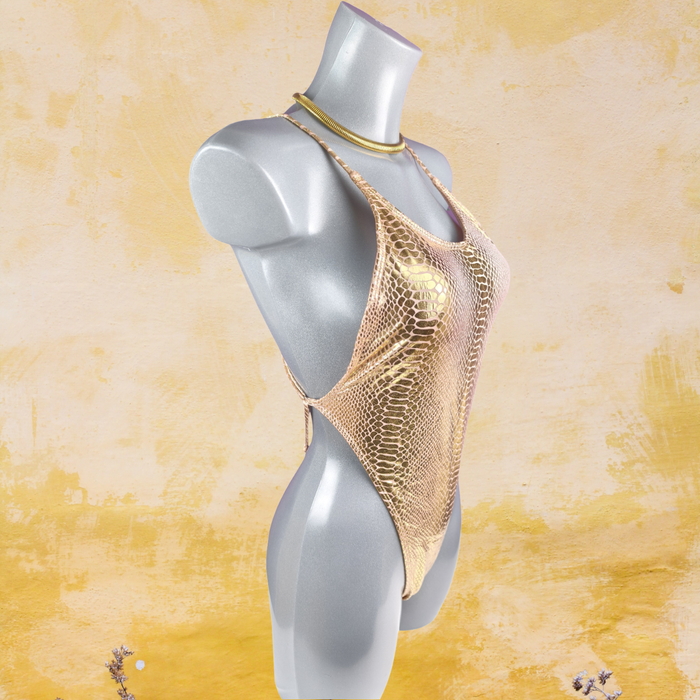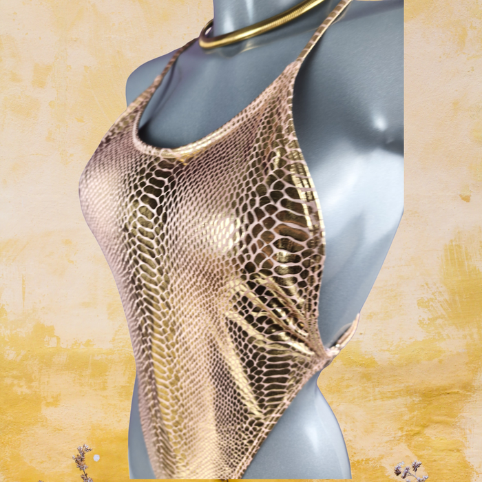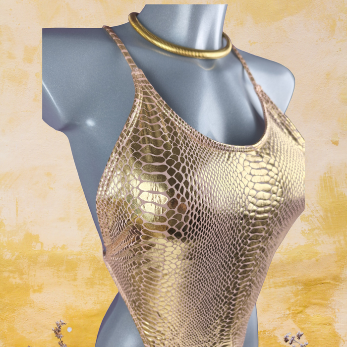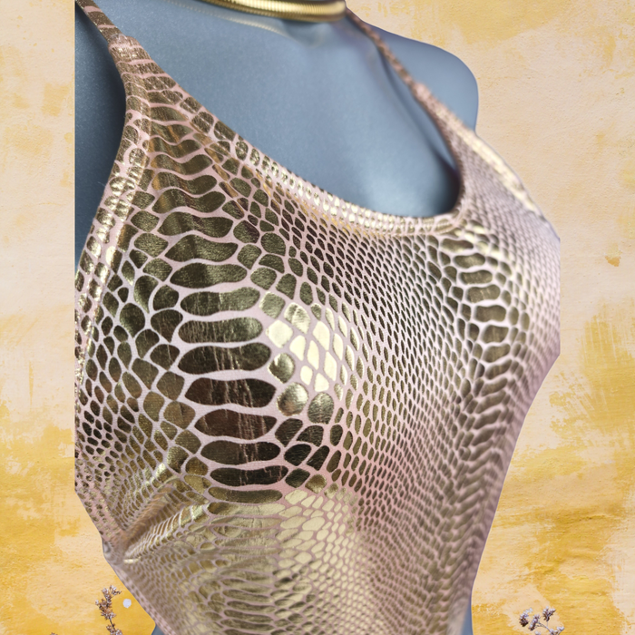Maillot de bain 1 pièce rose doré métallisé effet python, glamour & tendance– Taille 38
