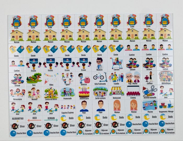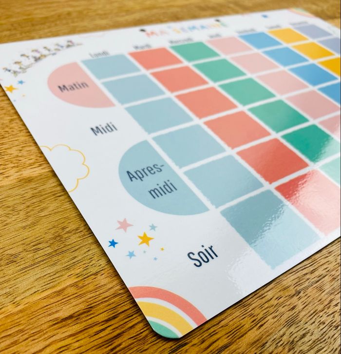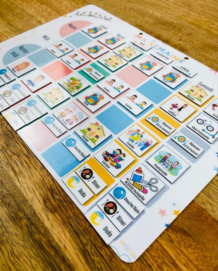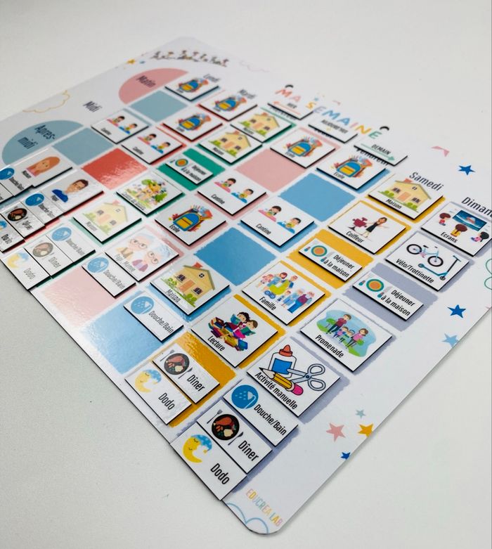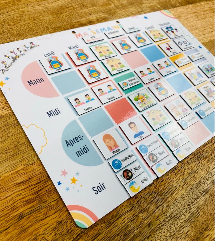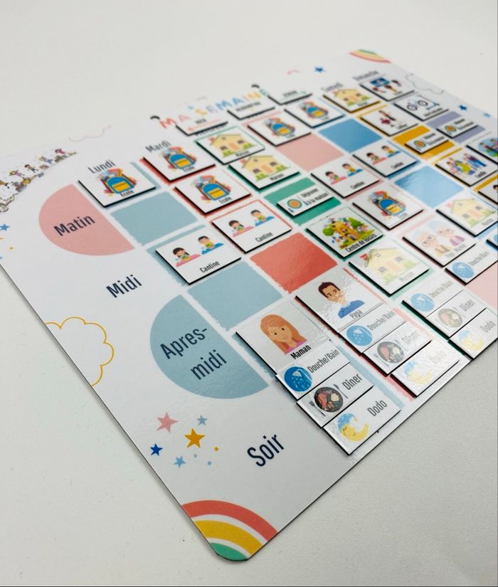 Petit semainier magnétique enfant A4 🗓️ 100 magnets inclus pour organiser la semaine, gagner en autonomie et réduire le stress familial. ✨ Un petit semainier, à prix tout doux ! ✨ Votre enfant vous demande sans cesse : « C’est quand la cantine ? », « J’ai sport aujourd’hui ? » Avec ce semainier magnétique compact, vous apportez des réponses claires et rassurantes… tout en rendant l’organisation familiale ludique et motivante. 👉 Conçu au format A4, avec ses 100 magnets variés (lecture, peinture, jeux, repas, sorties…). Sa taille compacte est un vrai avantage : facile à poser sur le frigo ou au mur, il reste toujours à portée de regard sans encombrer. 💡 Les bénéfices : • L’enfant visualise sa semaine et gagne en autonomie. • Moins de stress et de questions répétées pour les parents. • Un prix attractif, permettant d’équiper chaque enfant de son propre semainier pour éviter les conflits et favoriser l’organisation individuelle. Un petit format, mais un grand soutien dans le quotidien familial ✨. 📏 Dimensions : 21 x 29,7 cm (format A4) Contenu: 1 semainier magnétique 100 Magnets 10 Maison 10 École 7 Sieste 4 Cantine 4 Écrans 4 Lecture 4 Jeux 1 Parc 1 Fêtes 1 Sport 1 Dentiste 1 Bibliothèque 2 Maman 2 Papa 1 Périscolaire 1 Centre de loisir 1 Famille 1 Vélo/Trottinette 1 Copains/Copines 1 Coiffeur 1 Papi/Mamie 1 Activité manuelle 1 Anniversaire 1 Promenade 1 Nounou 1 Cinéma 1 Restaurant 1 Courses 1 Médecin 1 sortie scolaire 1 Piscine 1 Rangements / Ménage 7 Dodo 7 Dîner 7 Douche/Bain 6 Déjeuner à la maison 1 Aujourd'hui 1 Hier 1 Demain Créativement vôtre 🙂 Attention : Ceci n'est pas un jouet à utiliser sous la surveillance d'un adulte