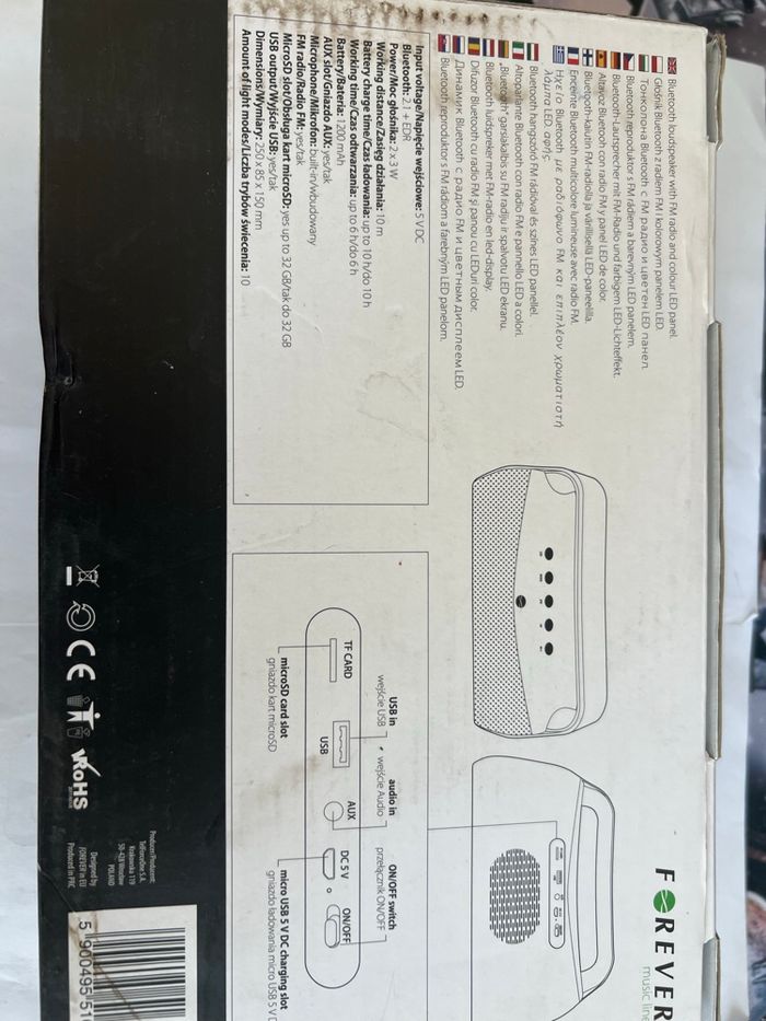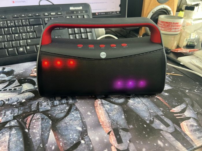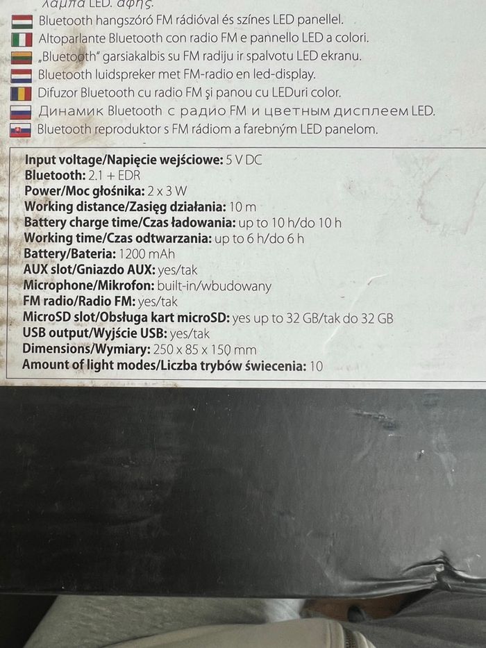 Bluetooth speaker BS610 Tension d'entrée : 5 V CC Bluetooth : 2.1 + EDR Puissance : 2 x 3 W Portée : 10 m Temps de charge : jusqu'à 10 h Autonomie : jusqu'à 6 h Batterie : 1200 mAh Entrée AUX : oui Microphone : intégré Radio FM : oui Emplacement microSD : oui (jusqu'à 32 Go) Sortie USB : oui Dimensions : 250 x 85 x 150 mm Nombre de modes d'éclairage : 10 Produit neuf Emballage d’origine