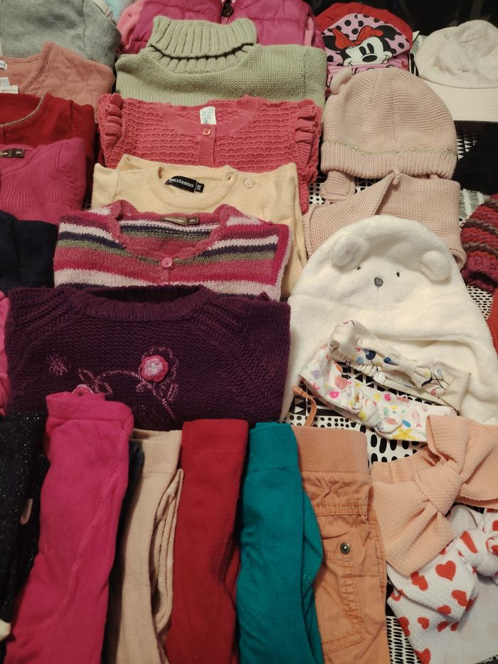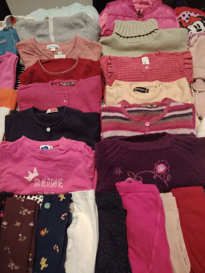Lot de 76 pièces pour fille de la taille 6/ 9/13/18/24 mois le tous en très bon état le lot et composer de pantalons vestes gilets robes collant short pyjama tee shirt pull bonnet casquettes débardeur de toute couleur