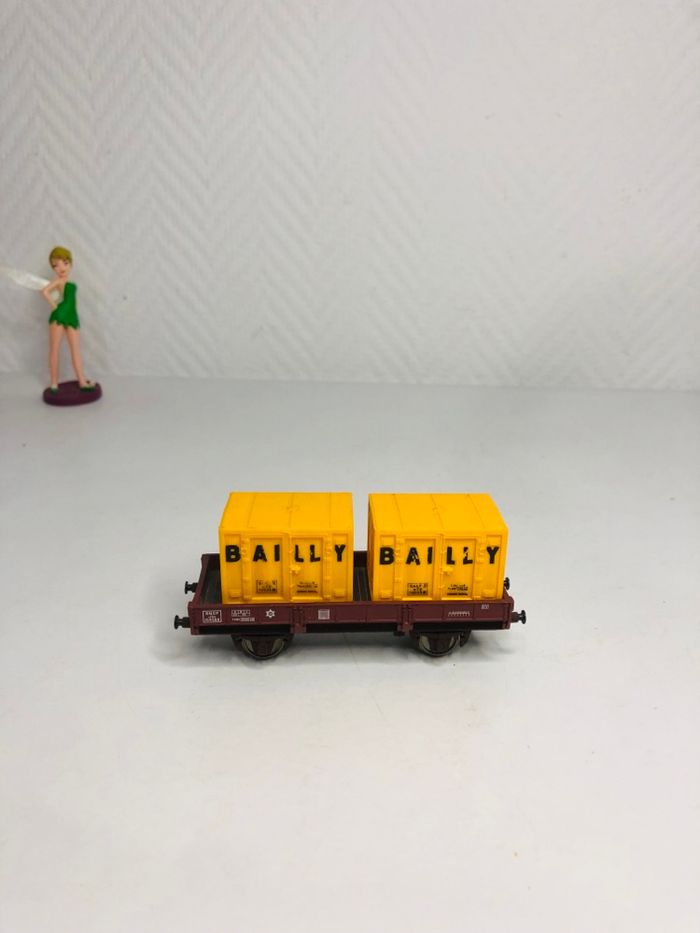 Wagon plat Jouef HO avec containers Bailly, idéal pour compléter votre collection de trains miniatures. - Type de produit : Wagon plat avec containers - Marque : Jouef - Modèle : 6450 En très bon état