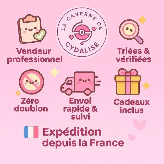 🎴 Lot de 55 cartes Pokémon ✨dont 5 cartes brillantes ✨ + 2 autocollants Pokémon 📦 Cartes officielles, françaises 📌 Sélectionnées de manière aléatoire. Chaque lot est unique. ❌ Sans doublons jusqu'à 200 cartes