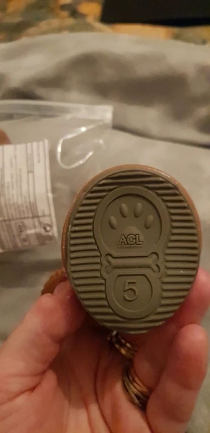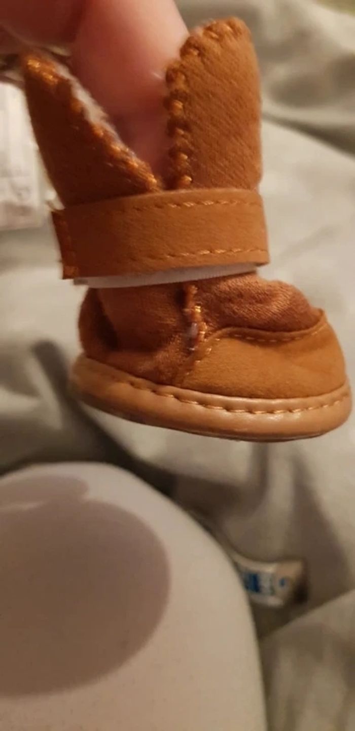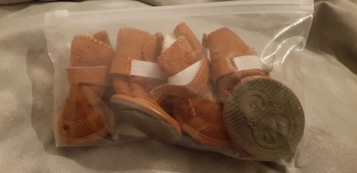 Jolies paires toutes neuves taille 5 fourrées à l'intérieur fermeture scratch et semelle épaisse pour éviter la patte mouillée Joli marron camel Voir les mesures et prendre celles de votre chien avec la patte posée au sol Je me suis trompée de taille malheureusement trop grandes pour mon petit épagneul tibetain de 7 kgs c etait trop chouette avec sa couleur de poils roux