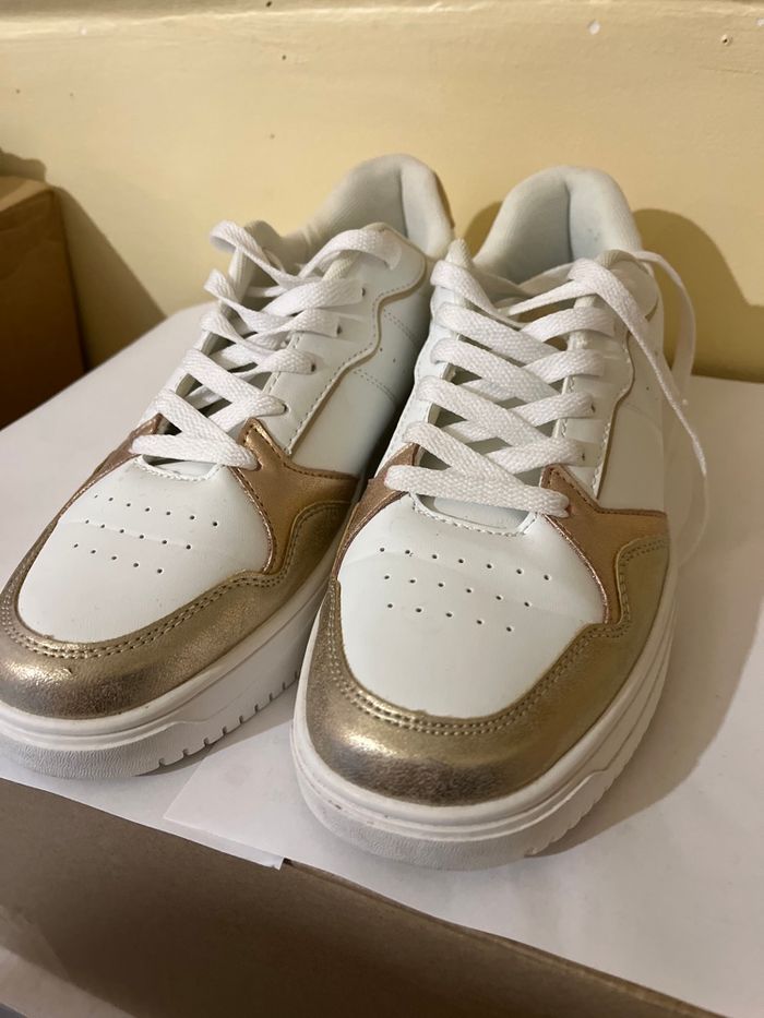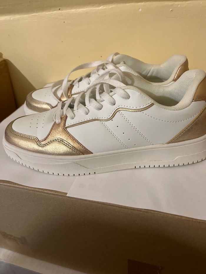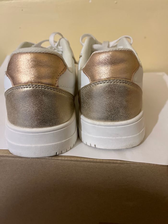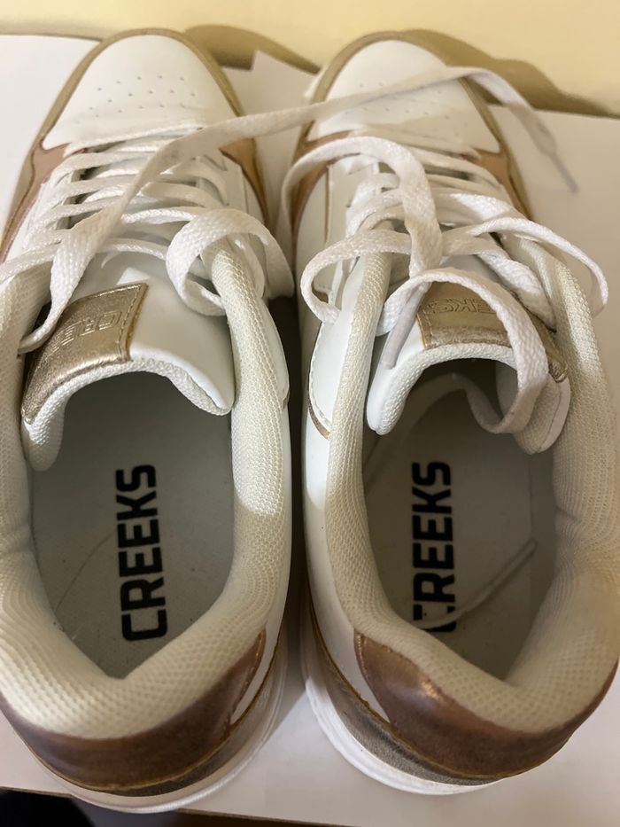 Basket blanche et doré De la marque Creeks Taille 40 En bon état général ( avec petit défaut devant voir photo 3 ) Trop grande pour moi porter une journée