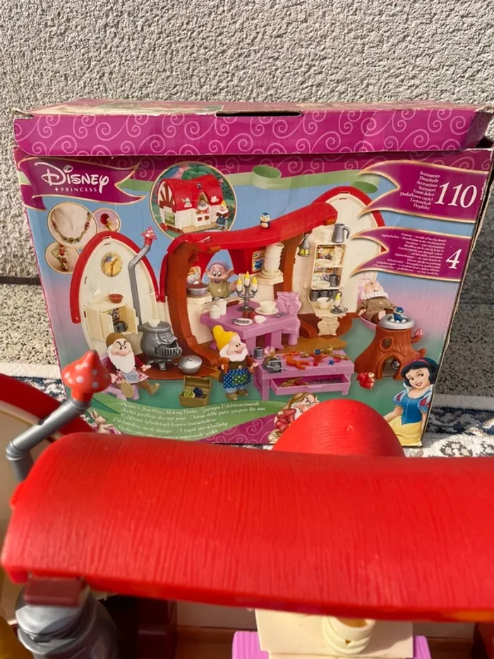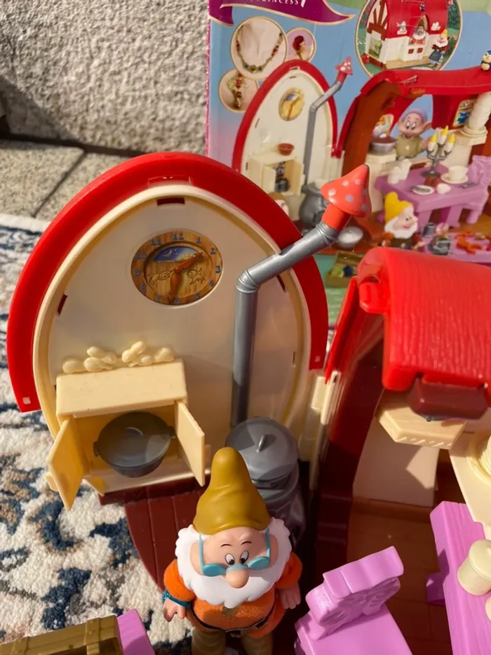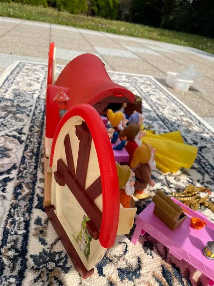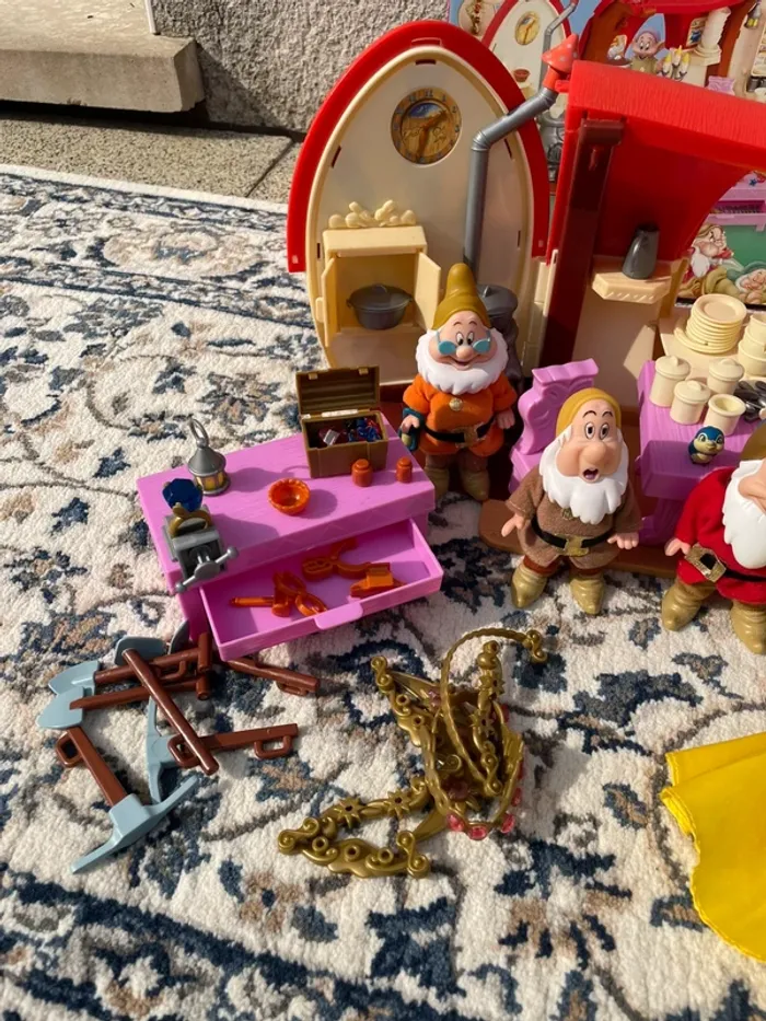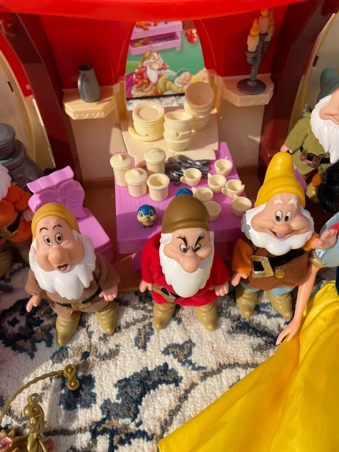 Je vends la maison des Septs Nains du film Blanche-Neige avec accessoires et poupées (Blanche-Neige et les septs nains). Possible traces d'usure liées au temps.