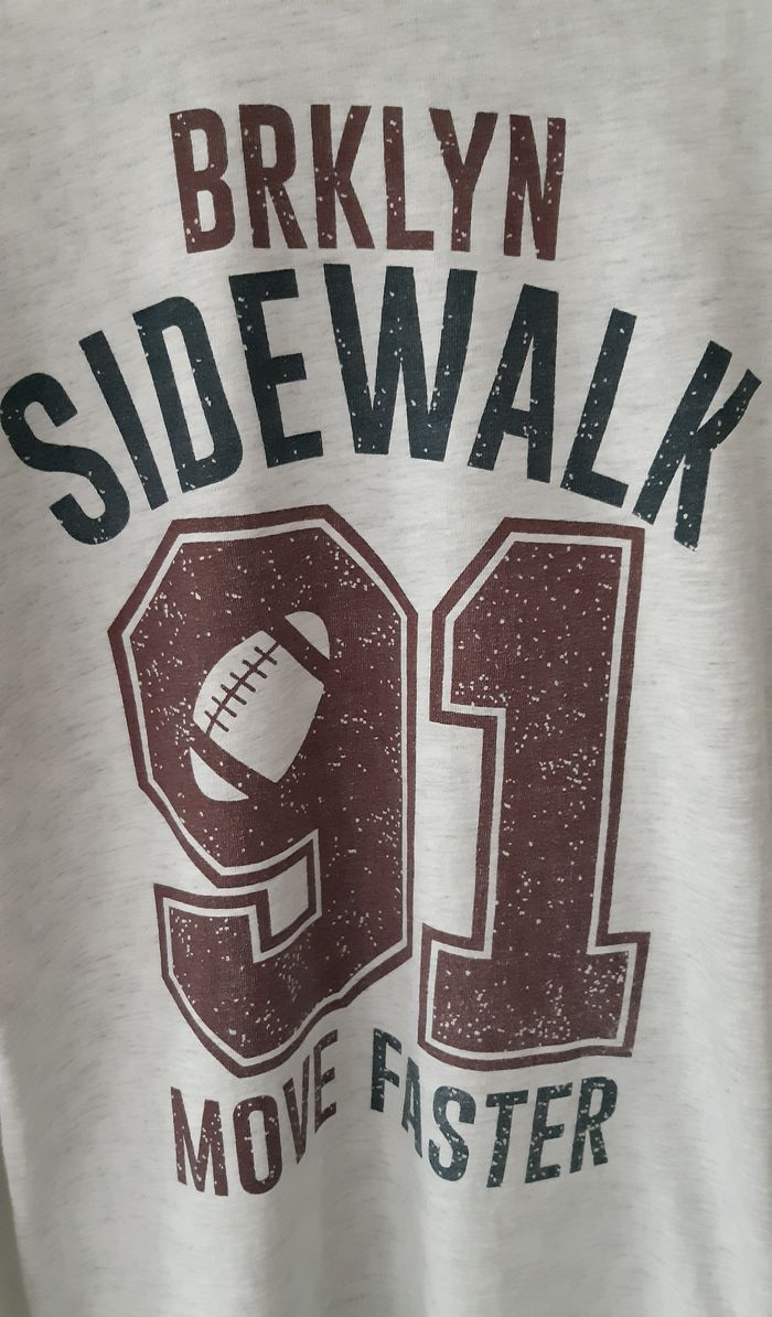 T-shirt manches longues garçon, marque Gémo, taille 10 ans (140 cm). ✔️ Style sport US / streetwear avec imprimé BRKLYN Sidewalk 91 ✔️ Couleurs crème et marron, facile à assortir ✔️ 99 % coton, confortable et agréable à porter ✔️ Très bon état : pas de trou, pas de tâche ✔️ Idéal pour l’école, le quotidien ou la mi-saison 📦 Envoi rapide et soigné 👕 N’hésitez pas à regarder mes autres articles