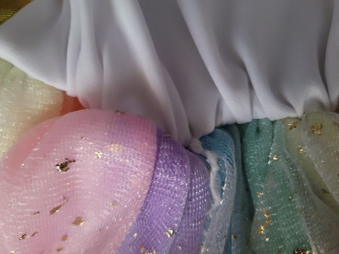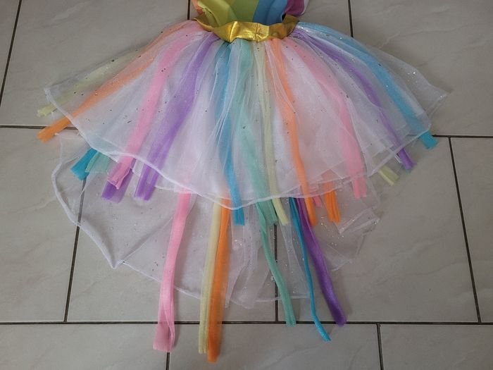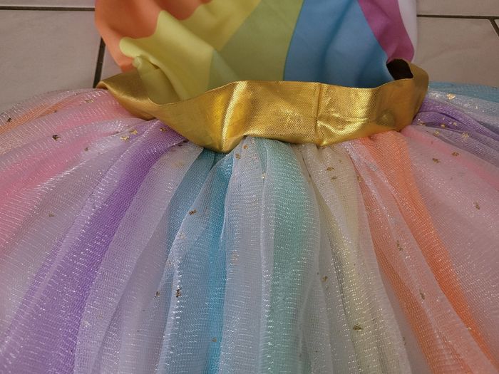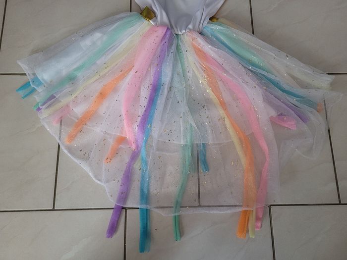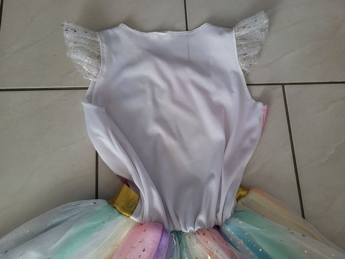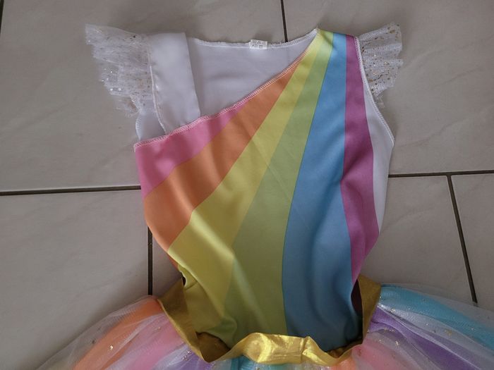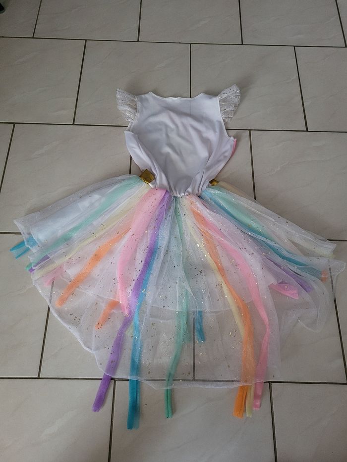 Vend déguisement fille licorne arc en ciel avec des ailes en très bon état juste des signes d'usures liés au port de la robe (voir photos). Taille XL mais correspond à 4/6 ans. Vendu tel que sur la publication.