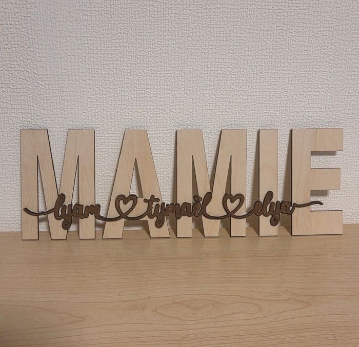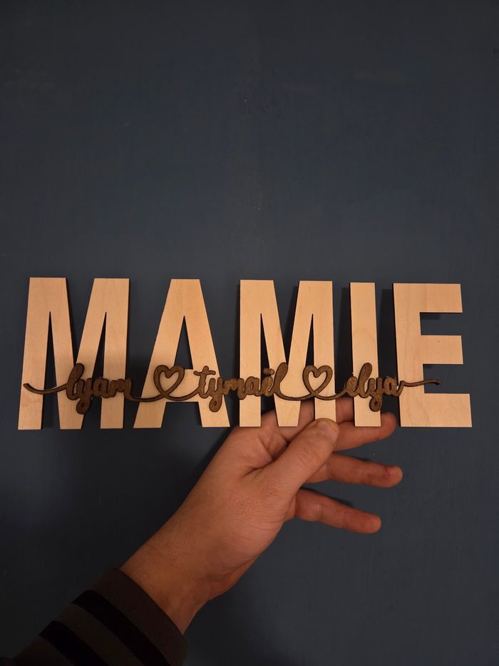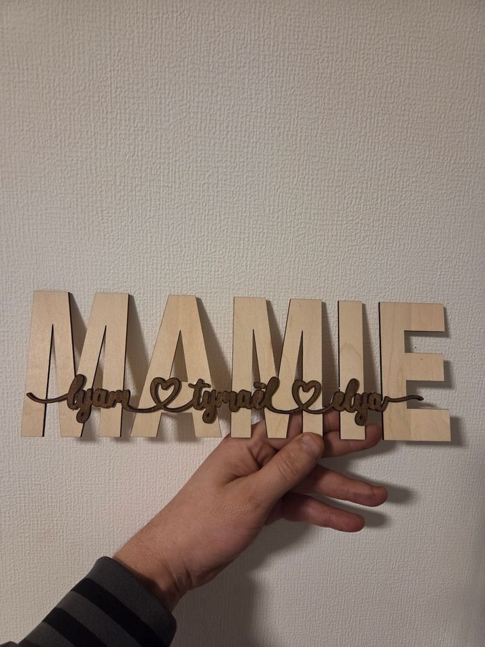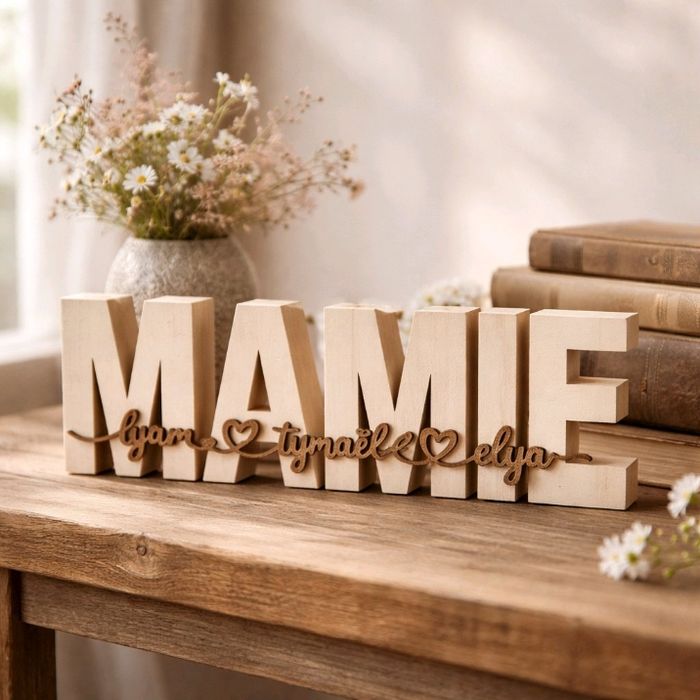 🌸 UN CADEAU D’AMOUR POUR MAMIE 🌸 Rendez hommage à votre mamie avec une décoration en bois gravée unique, spécialement personnalisée pour elle ! Notre décoration en bois “MAMIE” est personnalisable avec les prénoms de ses petits-enfants, un cadeau rempli de tendresse qui saura embellir son intérieur. Caractéristiques : • Bois naturel gravé avec soin • Personnalisation avec les prénoms des petits-enfants • Design élégant et chaleureux, avec un joli cœur pour symboliser l’amour familial • Dimension 33cm de large hauteur 10cm • La taille des prénoms à graver sur votre enseigne dépendra du nombre de prénoms choisis lettres etc • Il n'y aura pas de majuscule ni accents sur les prénoms dû à la calligraphie ✨ Idéal pour décorer : une étagère, une table de chevet, ou un coin douillet de son salon, pour un rappel quotidien de l’amour de sa famille. 🎁 Parfait pour un anniversaire, la fête des grands-mères ou simplement pour lui faire plaisir, ce produit Domicréa est une belle manière de lui montrer combien elle compte pour vous. Chaque pièce est réalisée avec amour pour offrir un souvenir unique et éternel. Un cadeau personnalisé, rempli de douceur et de souvenirs, pour toutes les mamies !