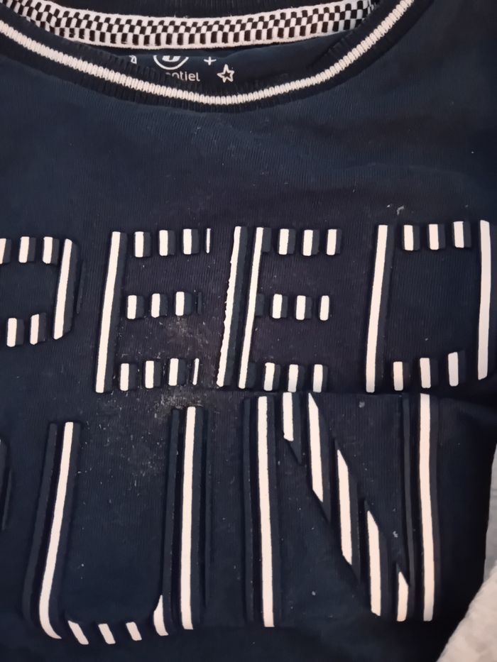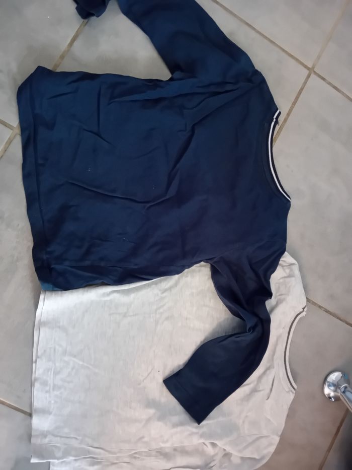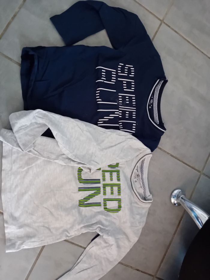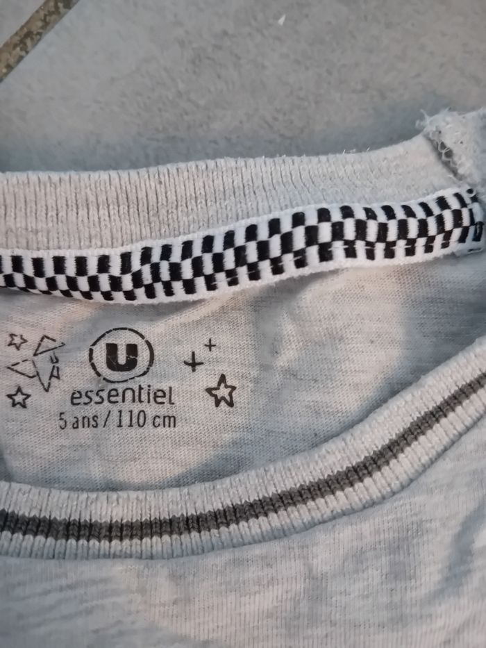 Lot de 2 tee shirt manche longue. Taille 5 ans. Marque U. Le bleu presente une tache. ( je ne sais pas si elle part au lavage) sinon pas de troues. Et le gris est en bon etat.