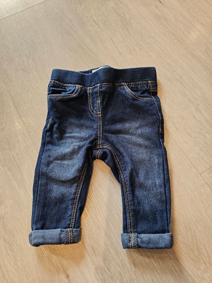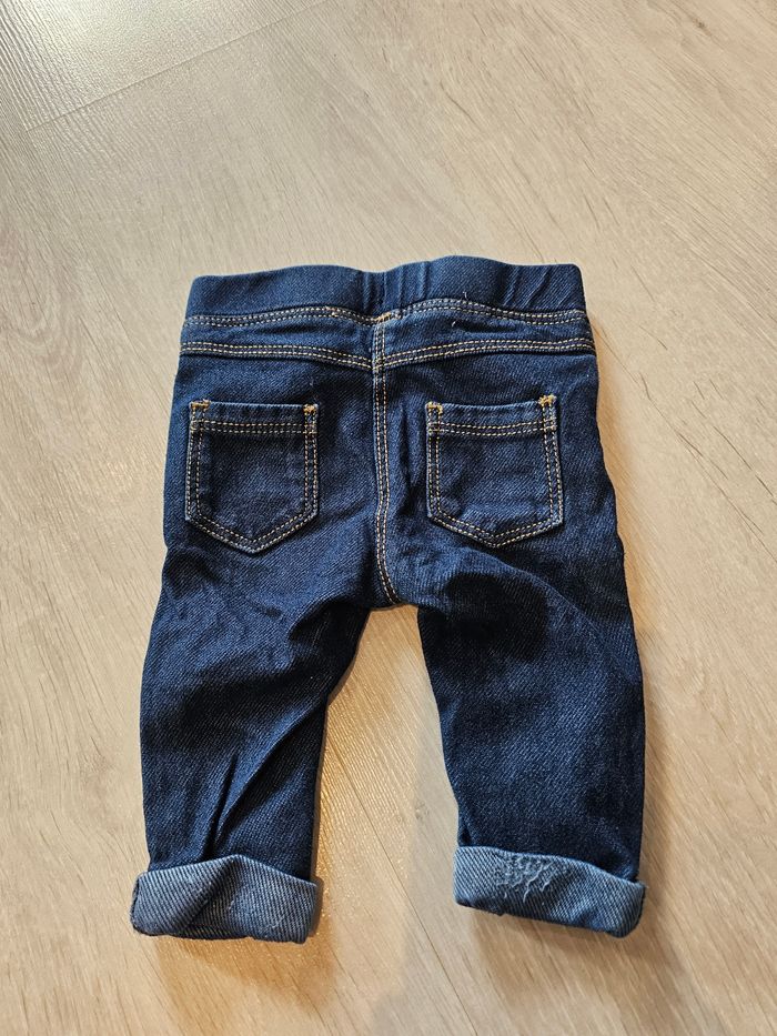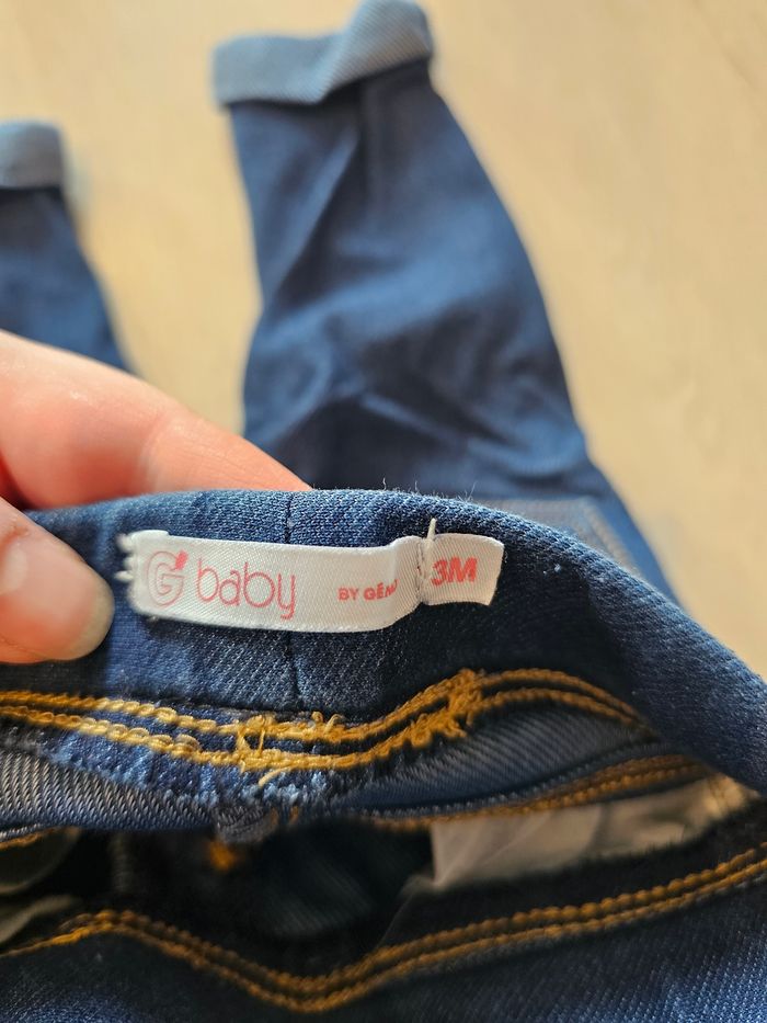 Legging imitation jeans. Très bon état général hormis l'arrière du revers de la jambe droite (photo 3) qui présente un défaut. Taille 3 mois