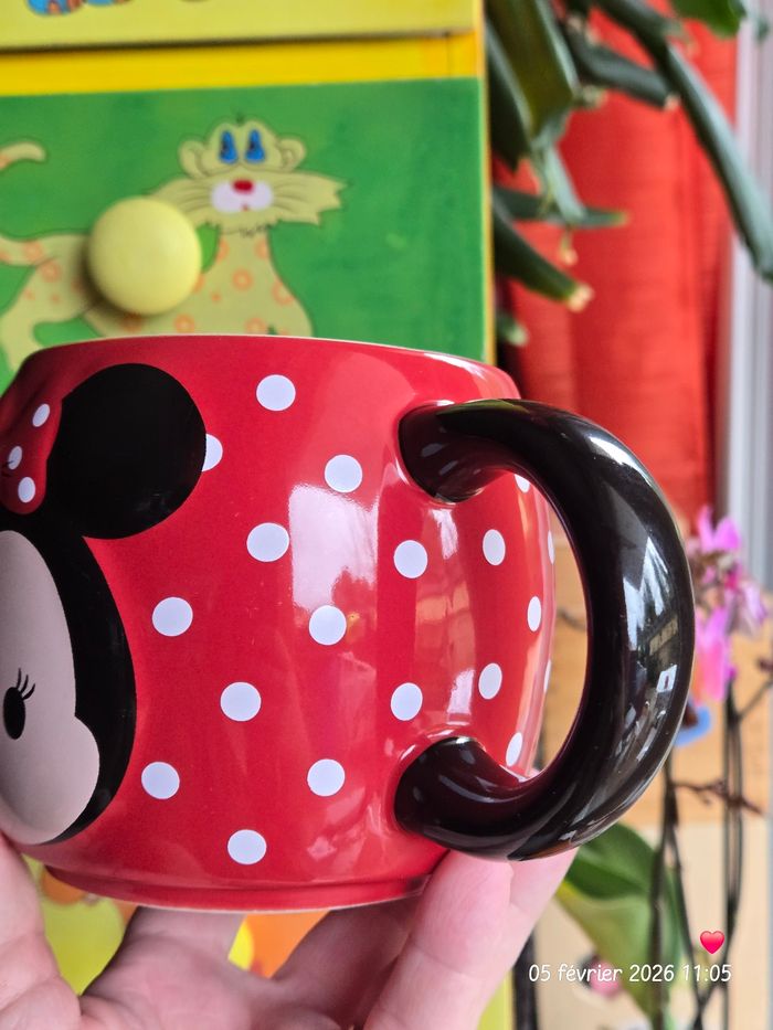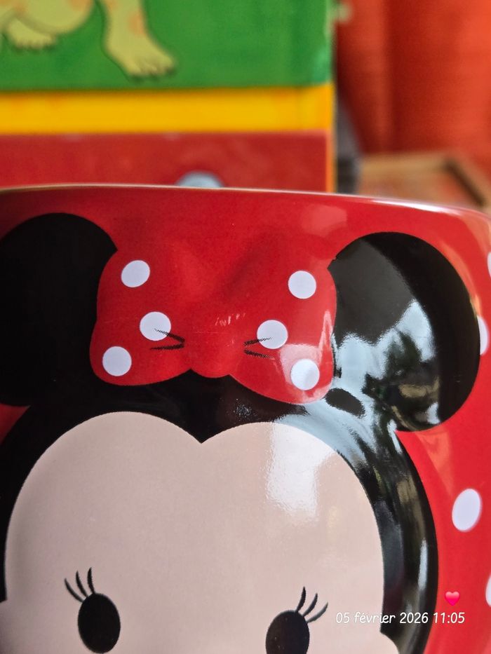 Mug Minnie Mouse – Disney Store – Bon état Je vends un mug Minnie Mouse en bon état. Il a servi, mais reste propre et fonctionnel. Comme vous pouvez le voir sur les photos, il y a quelques légères petites traces à l’arrière du mug ainsi qu’à l’avant (j’ai rapproché la photo pour mieux montrer). Rien qui n’empêche l’utilisation. ✔️ Produit Disney Store officiel ✔️ Céramique solide ✔️ Couleurs vives, motif Minnie Mouse Prix : 11 €