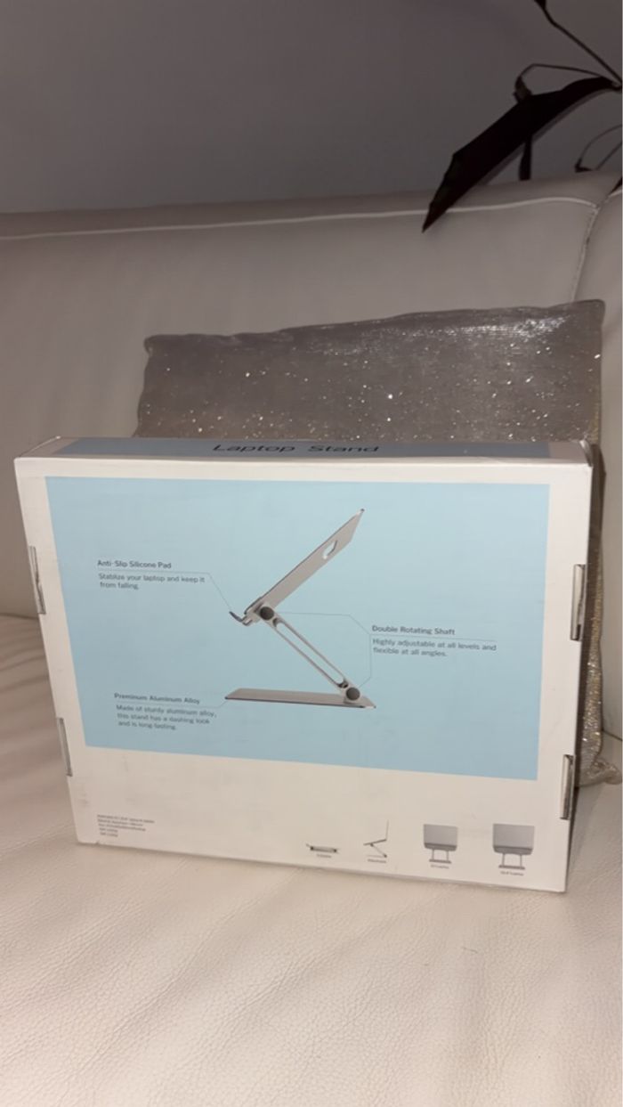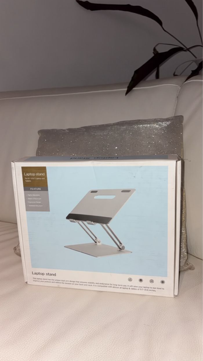> Je vends ce Support pour ordinateur portable et tablette acheté il y a quelques mois pour mon télétravail. > * Pourquoi je m'en sépare : Je fais un grand tri dans mon bureau et mon setup de télétravail car je ne l'utilise pas. > * État : Neuf jamais ouvert de l’emballage. > * Détails techniques : Fabriqué en alliage d'aluminium premium. Il est entièrement pliable et réglable en hauteur/angle pour améliorer la posture (ergonomique). Compatible avec les ordinateurs de 9,7 à 15,6 pouces.