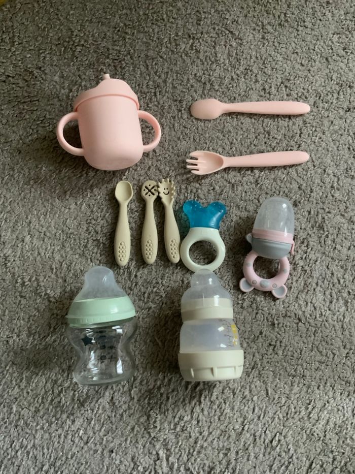 L’eau variée d’accessoires pour bébé en très bon état, idéal pour les repas et l’apprentissage de l’autonomie. Un biberon team Tommy tipi en verre et un biberon Mam pour des raisons d’hygiène, il n’y a pas les tétines fournies. Trois couverts d’apprentissage. Un anneau réfrigérants. Un croque fruit. Petit lot de vaisselle en silicone rose