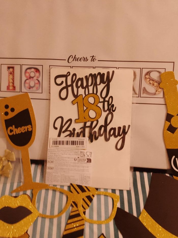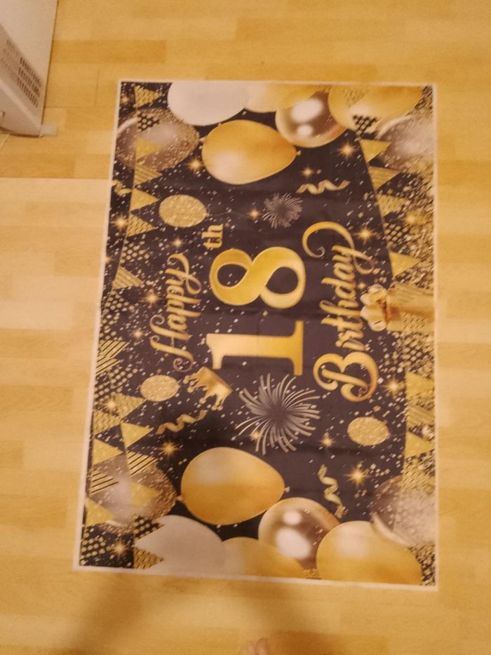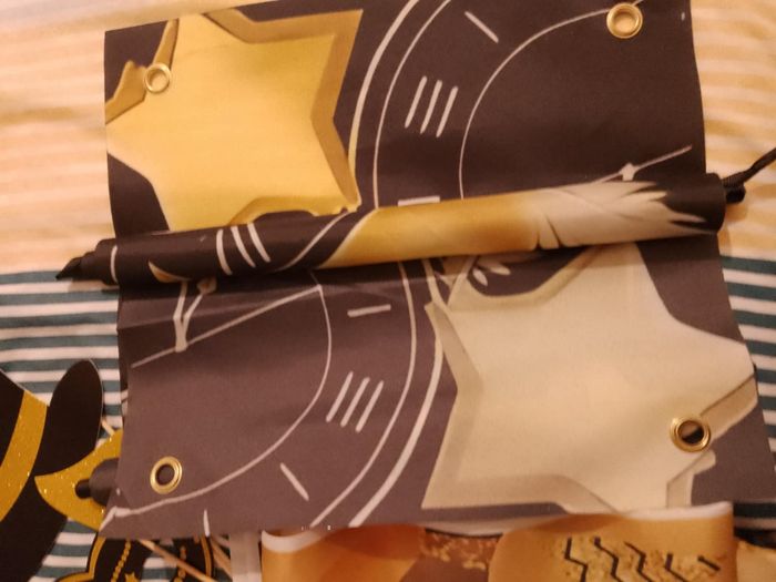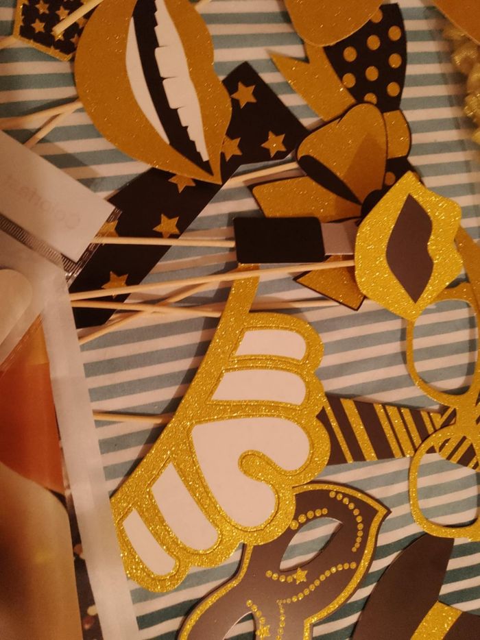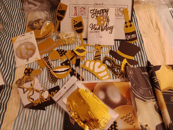2 parchemins a accrocher Une banderole 15 petits nœuds dorés 1 Décorations à poser sur le gâteau Un cadre signature Un rideau à franges Accessoires photobooth... Certains articles sont neufs