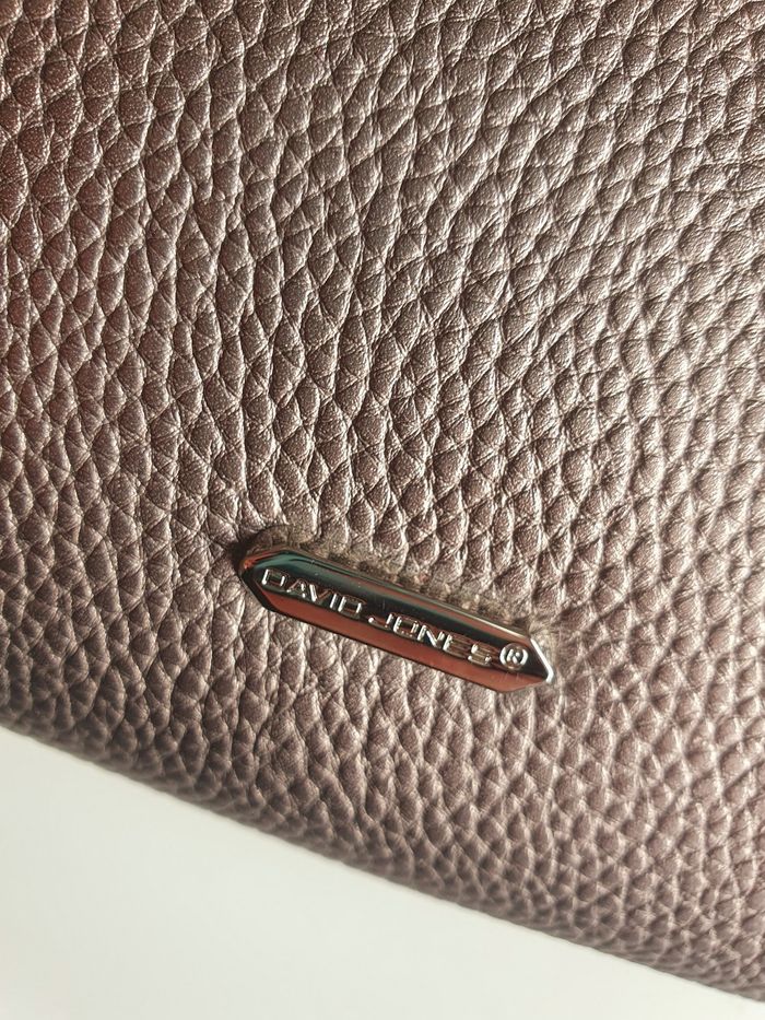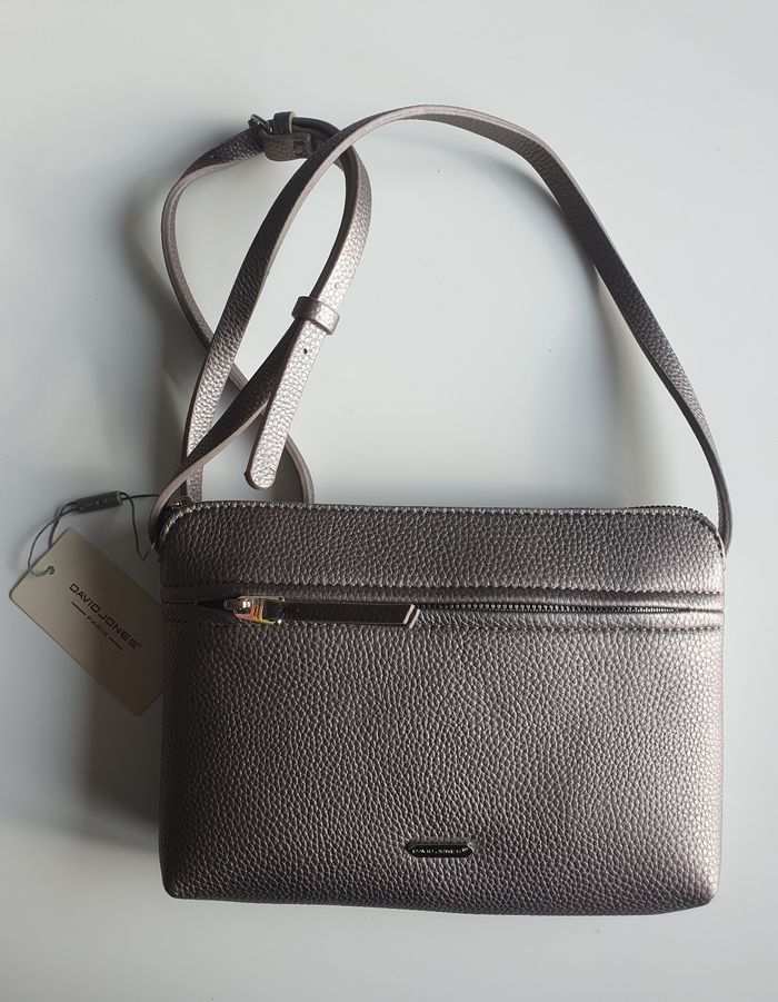 Sac pochette bandoulière David Jones Coloris argenté Poche unique + poche zippée à l'intérieur, et poche zippée sur le devant Simili cuir, grainé Fermeture par zip Bandoulière réglable Longueur environ 24 cm et 15 cm de hauteur Neuf avec étiquette, jamais utilisé