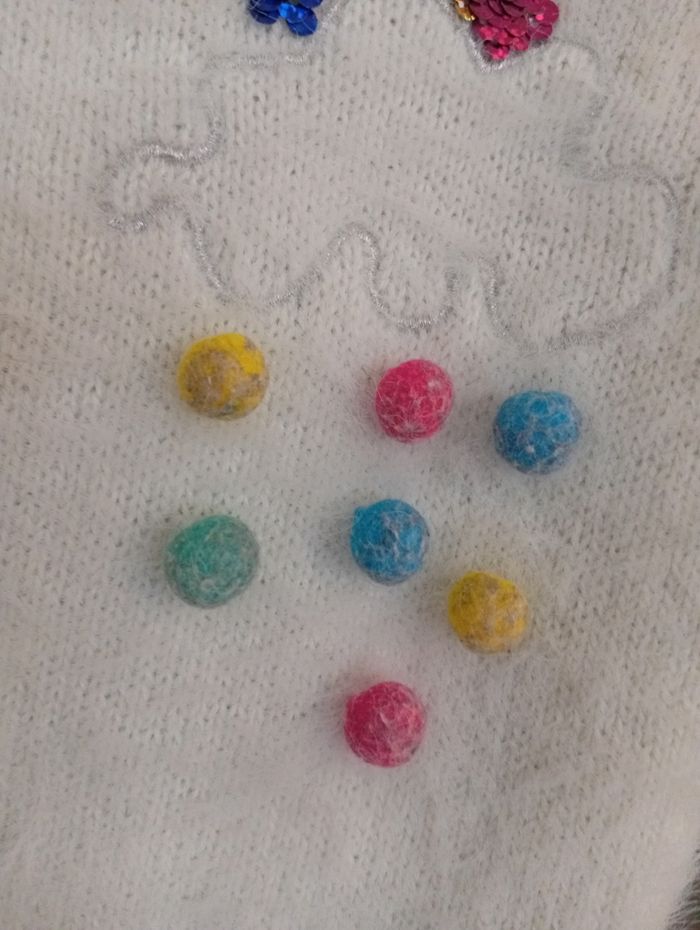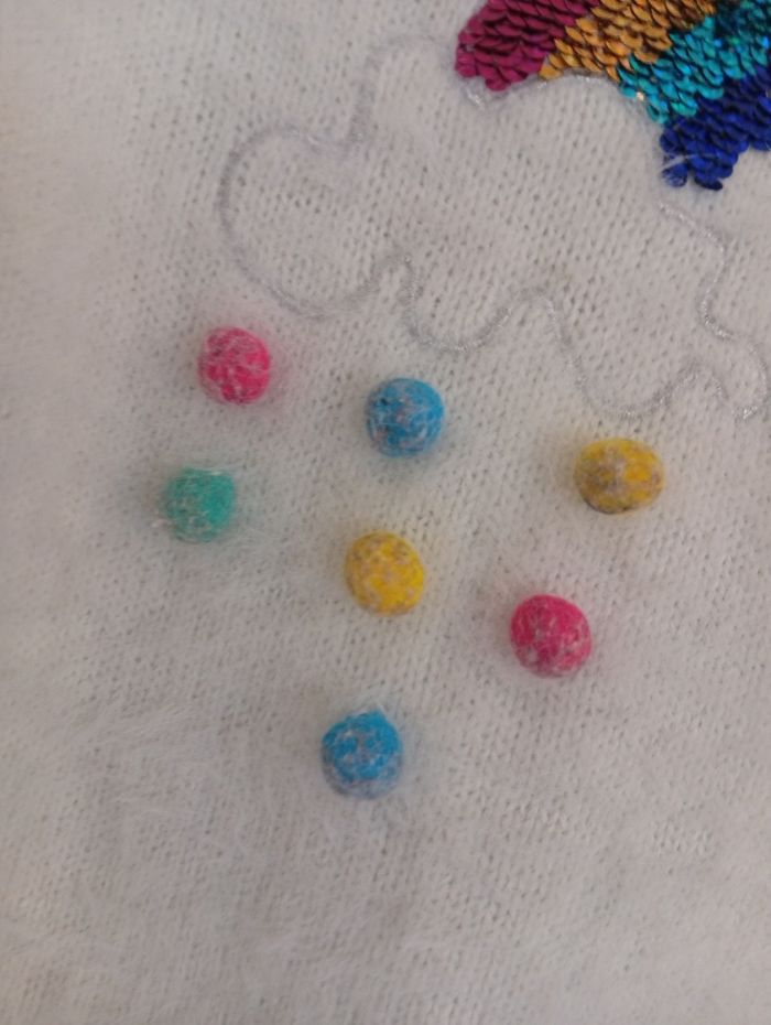 Duveteux. Nuages. Petites boules multicolores un peu usées.