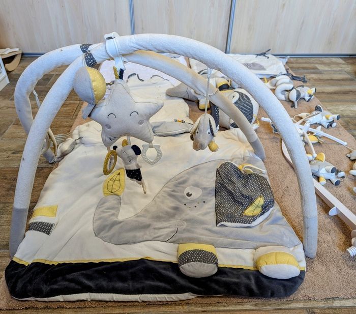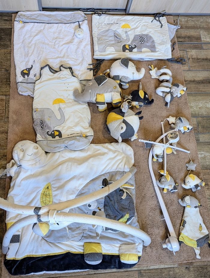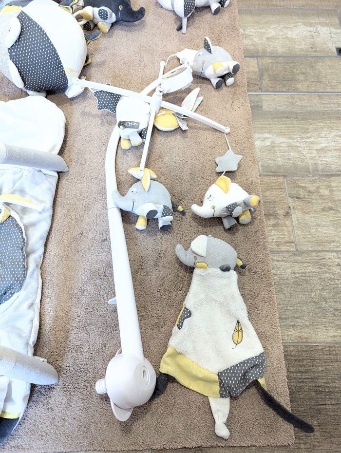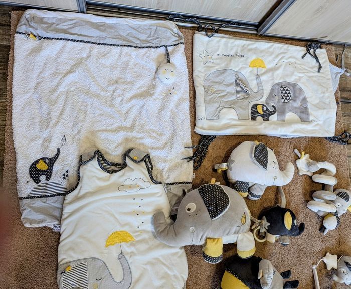 Collection BabyFan (12 pièces) marque Aubert - tapis d'éveil - gigoteuse 0-6 mois - pyjama BabyFan - housse pour matelas allongé - Tour de lit avec coussin - mobil fonctionnel - 3 peluches - berceuse - doudou - attaché poussette - doudou pour poussette Maison non fumeur. Chambre bébé et accessoires