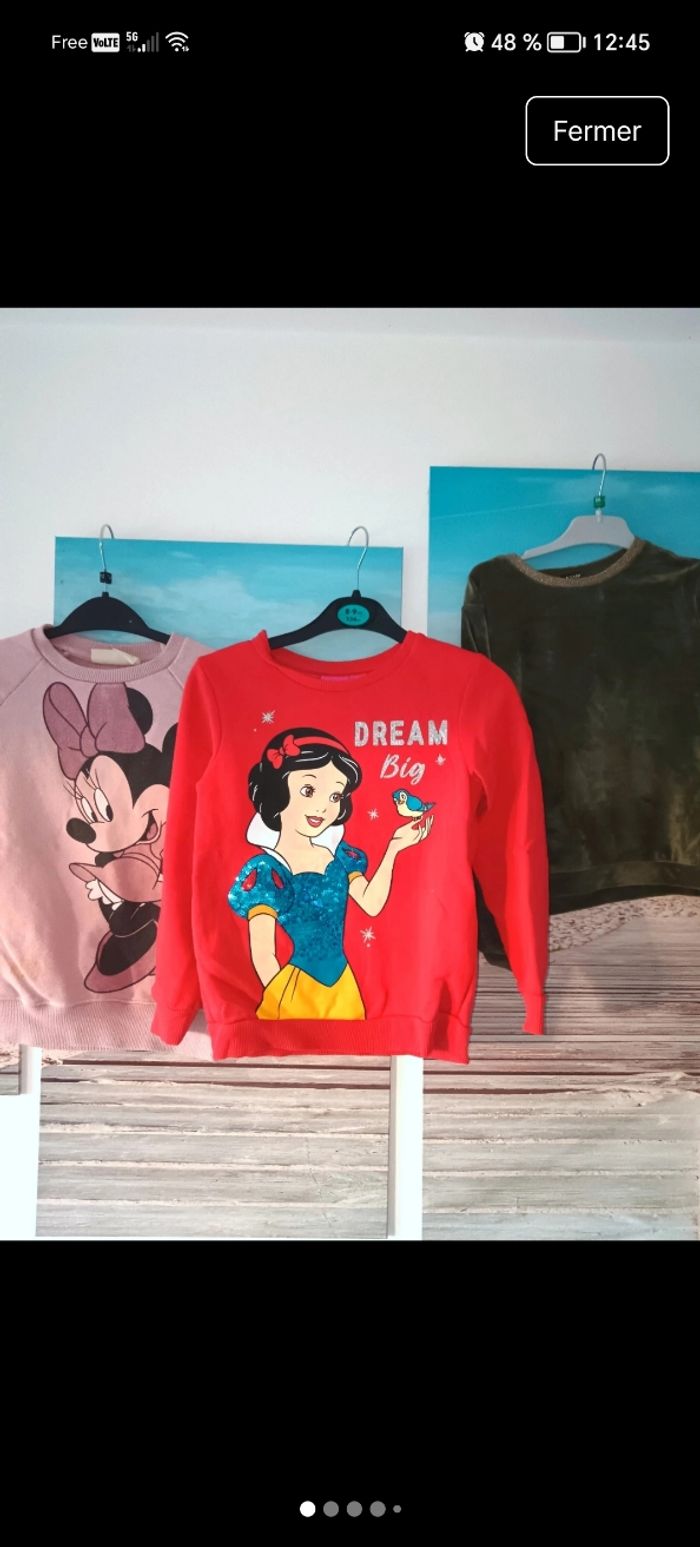 Lot pull fille taille 5 6 ans en bon état Pull blanche neige des paillettes manque voir les photos Pull minnie tâches voir les photos Pull kaki velour très bon état