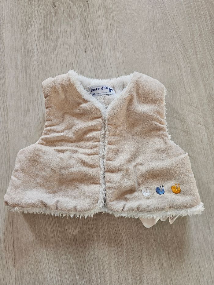 Veste fourrée sans manches "Sucre d'Orge". Très bon état Taille 3 mois