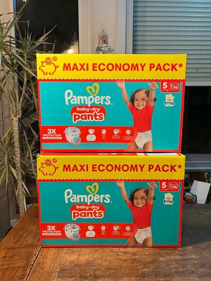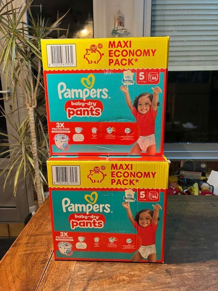 Code -15€ : COEUR30 Jusqu’au : 08/02/26 Lot : 2 cartons neufs. Variété : Pampers baby dry en PANTS. Taille 5 : Bébé 11 -17 kg Quantité : 172 (2*86) PANTS. #taille5 #couchetaille5