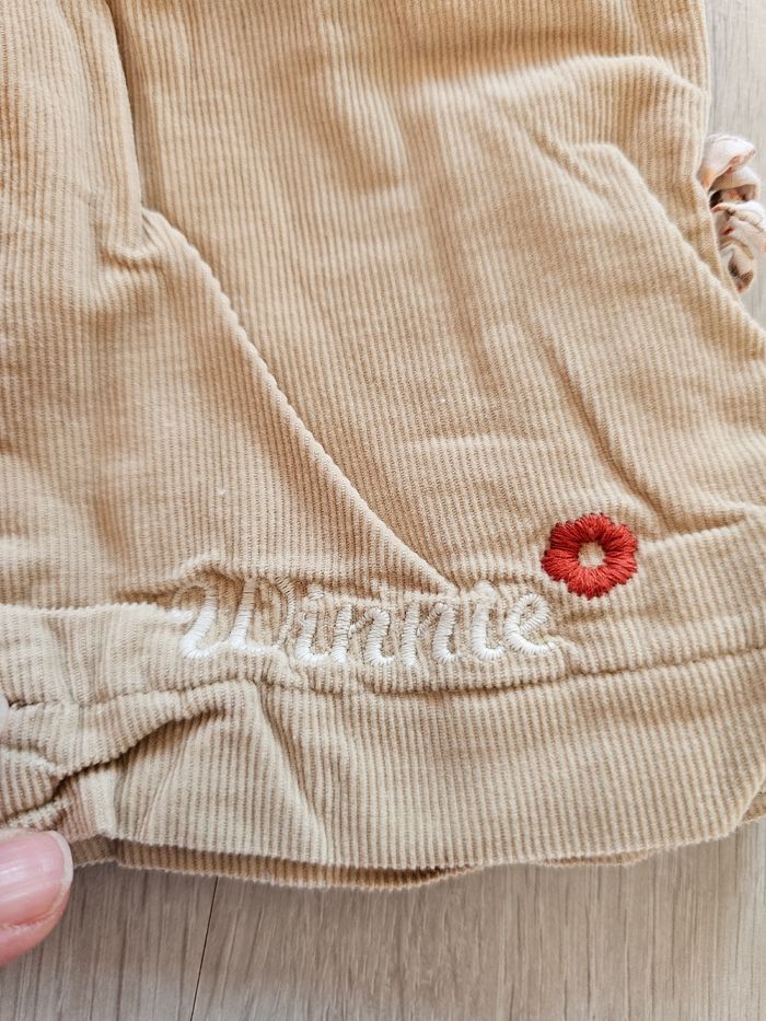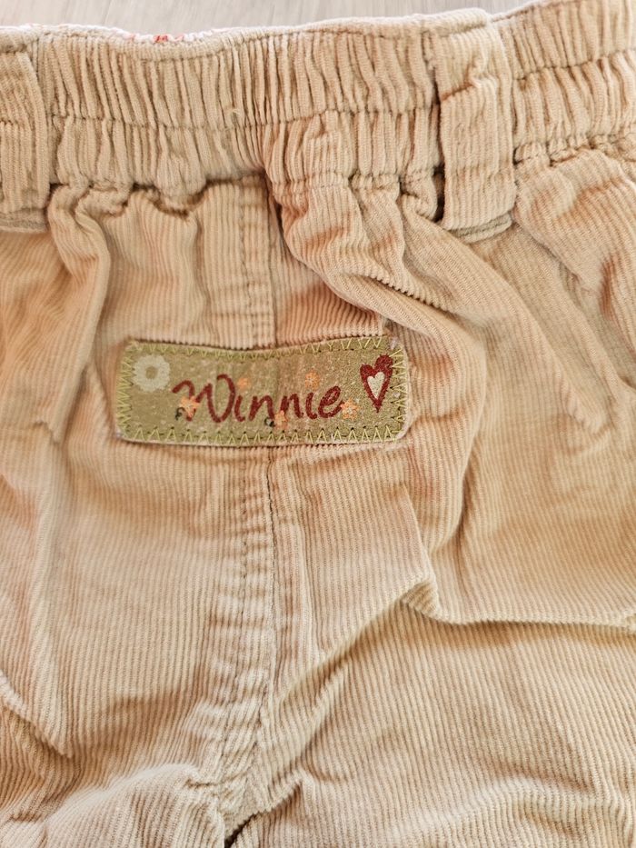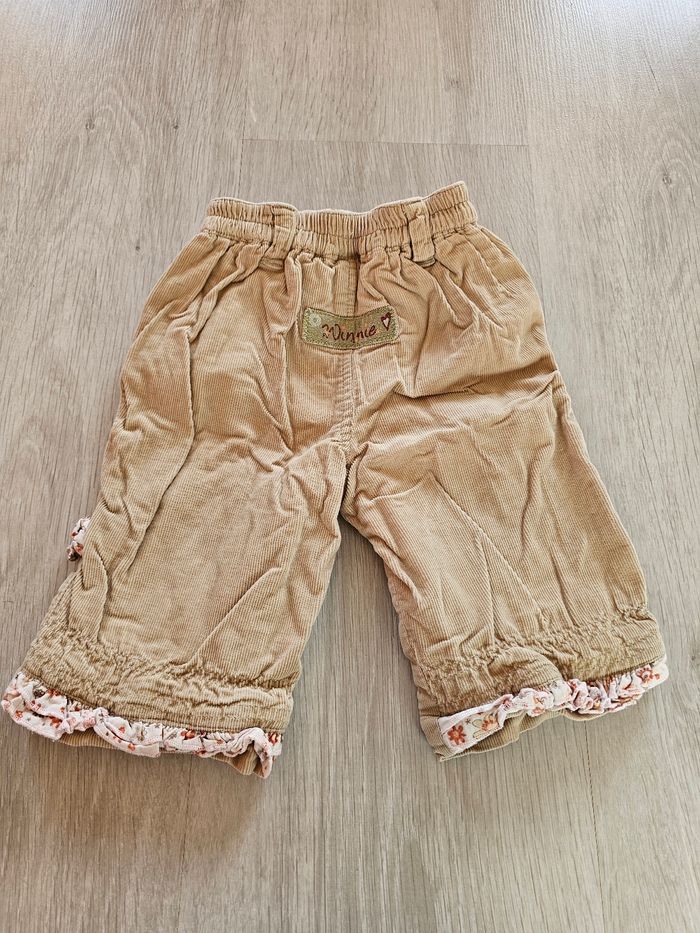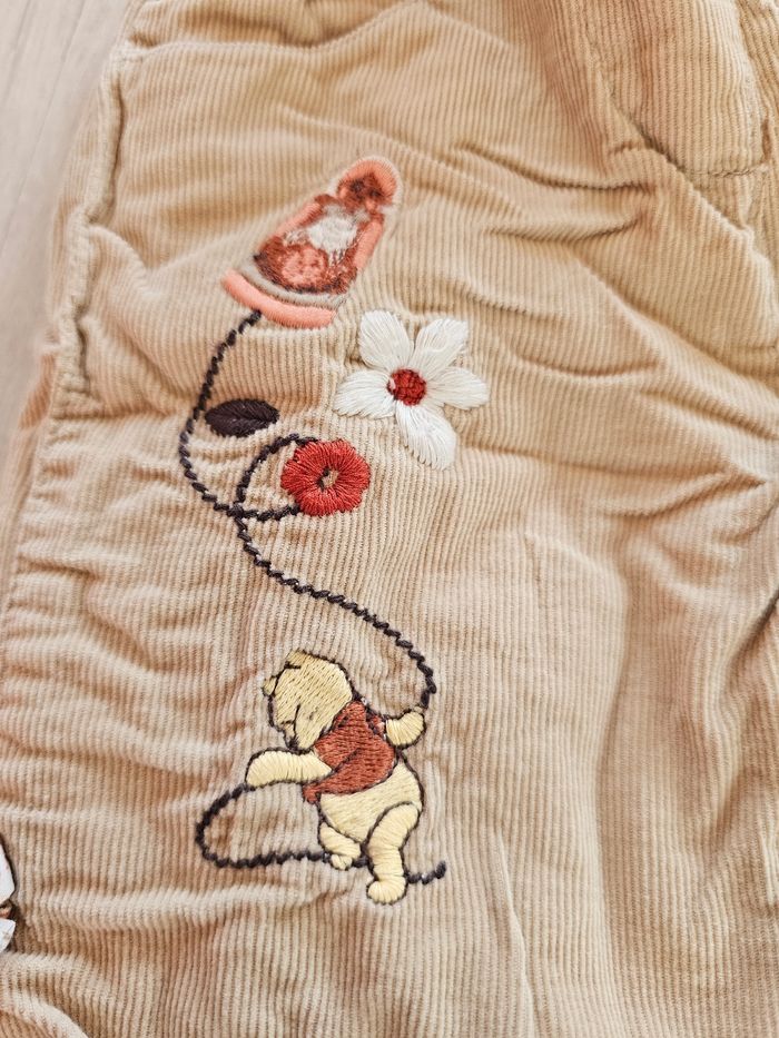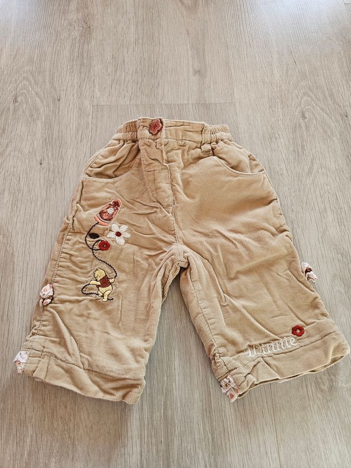 Pantalon Disney Baby "Winnie l'ourson" Bon état, les nœuds sur les côtés des jambes auraient besoin d'être repassés pour reprendre leur forme. Taille 3 mois