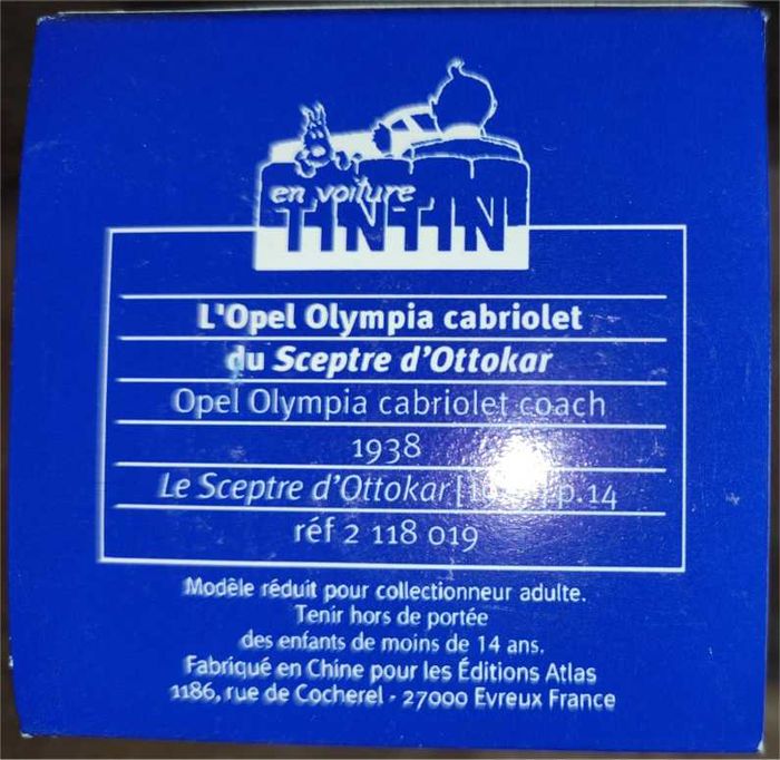 🚗 L'Opel Olympia cabriolet 🚗 du Sceptre d'Ottokar + Certificat d'authenticité Collection En Voiture Tintin Editions Atlas N° 19 dans la collection Conducteur : un bandit syldave Passager : son complice Modèle d'inspiration pour Hergé: Opel Olympia cabriolet coach 1938 Retrouvez la dans l'album Le Sceptre d'Ottokar (1947) p.14 Echelle : 1/43 Taille de la voiture : 90mm Matière : Métal Année : 2004 Origine : France Réf: 2118019 Livré dans sa boîte bleue d'origine avec son certificat d'authenticité. .