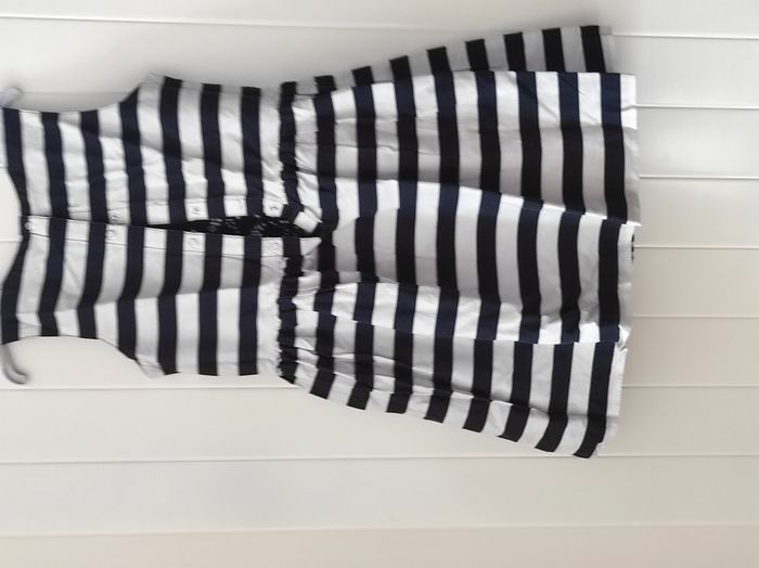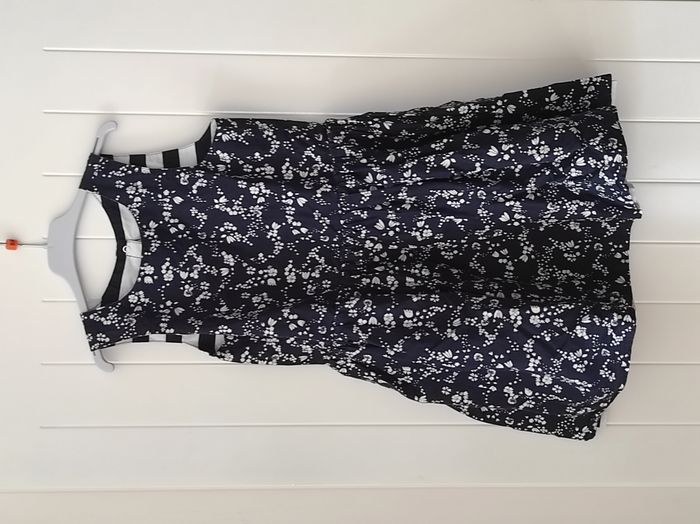 "Jolie robe sans manches pour fille, taille 8 ans. ✨ Réversible : un côté à motifs floraux un côté à rayures 🎨 Coloris : marine et blanc 🔘 Fermeture par pressions dans le dos 📦 Très bon état, aucun défaut à signaler Idéale pour l’été ou les occasions spéciales."