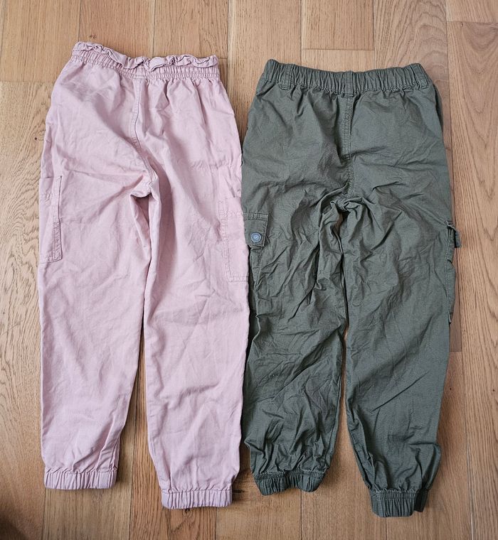 Faciles à enfiler. Taille elastique. 2 poches sur les jambes. Le kaki 8 ans est de la marque TAO 100% coton. Le rose 7/8 ans est de la marque h&m 54% coton 46% viscose. Peu portés, super etat.