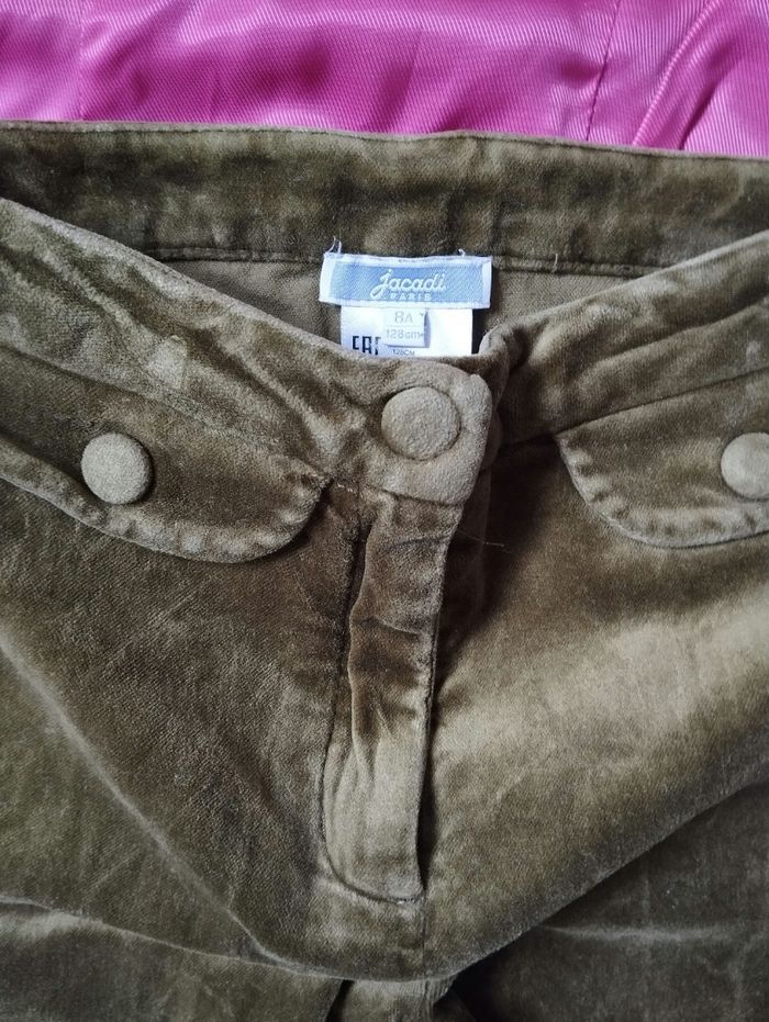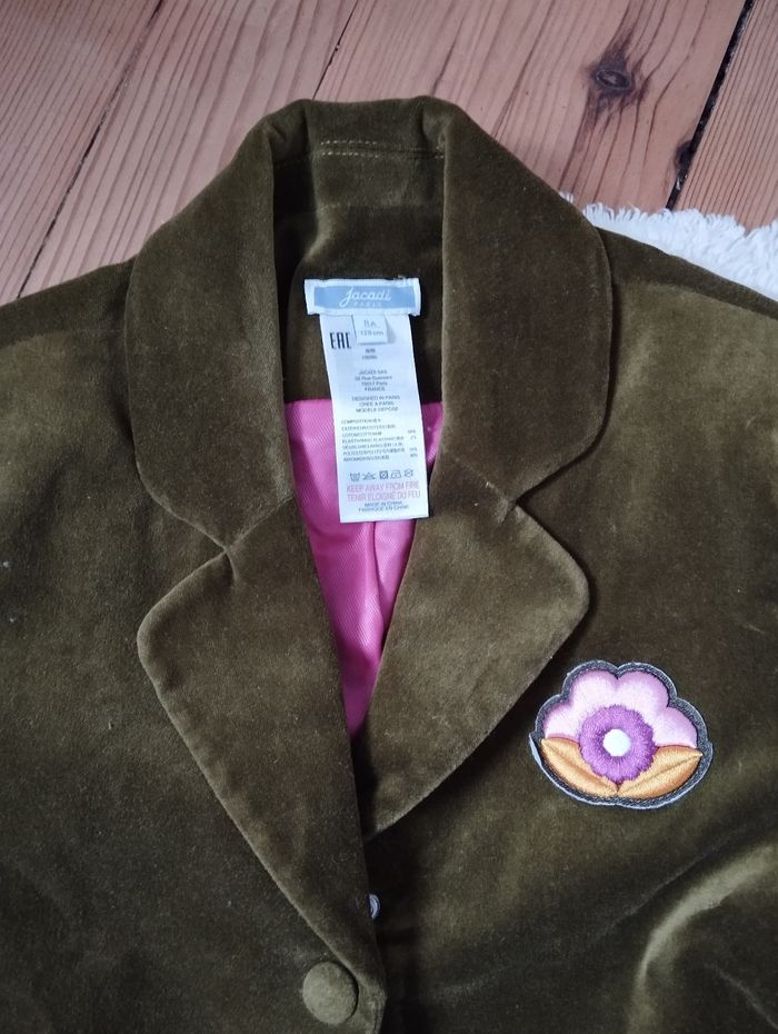 Ensemble tailleur veste et pantalon en velours kaki doublé d'un tissu satiné fushia. Fermeture de la veste et du pantalon par des boutons pression. Les couleurs sont beaucoup plus vives en réalité que sur la photo. Porté une fois, comme neuf. Taille 8 ans.