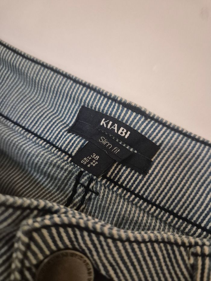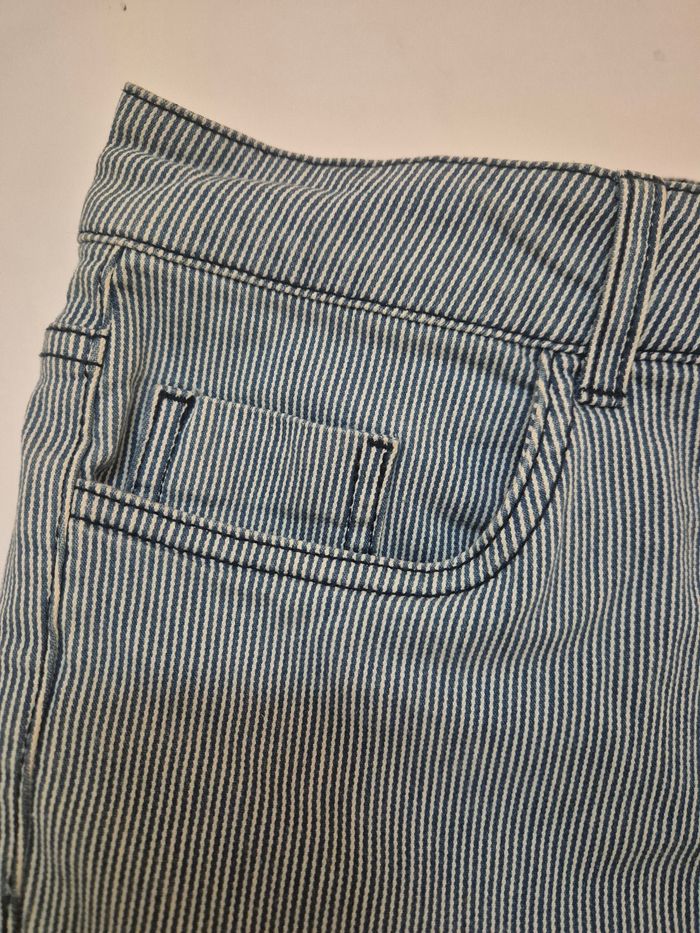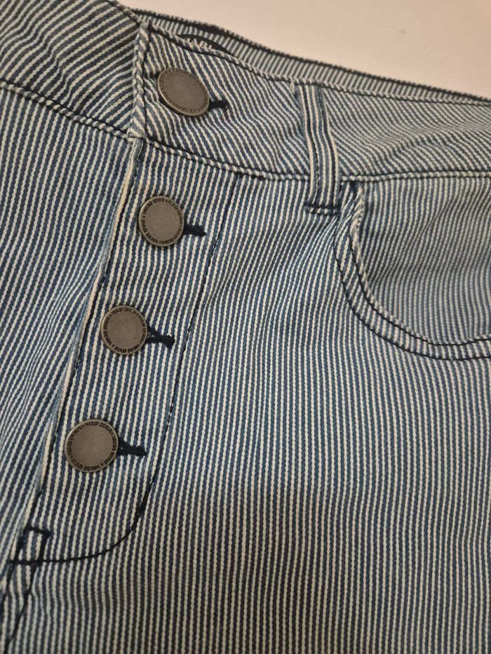 Un joli jean confortable et stretch. On aime les fines rayures qui change le style de cette coupe slim. Jean stretch. Coupe slim. Fines rayures. Ouverture devant par boutons. 2 poches devant + 1 poche ticket. 2 poches plaquées au dos. Petite fente sur la cheville. Jamais porté !