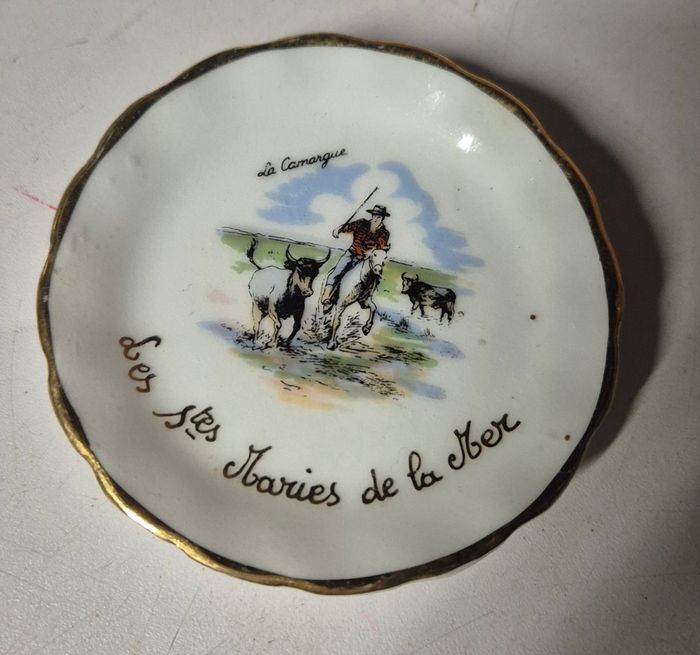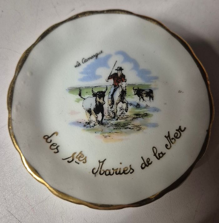 petite assiette décorative en porcelaine véritable. diamètre 8 cm illustrant une scène typique de la camargue : un gardian à cheval guidant des taureaux noirs dans un paysage pastoral. inscription "la camargue" en haut et "les stes maries de la mer" en bas, évoquant la tradition et le folklore du sud de la france. bord festonné avec liseré doré. pièce vintage idéale pour collectionneur, décoration murale ou souvenir régional. #assiettesouvenir #porcelainecamargue #gardian #chevalcamargue #taureauxcamargue #lesstesmariesdelamer #décorationmurale #vaissellevintage #folklorefrançais #petiteassiette