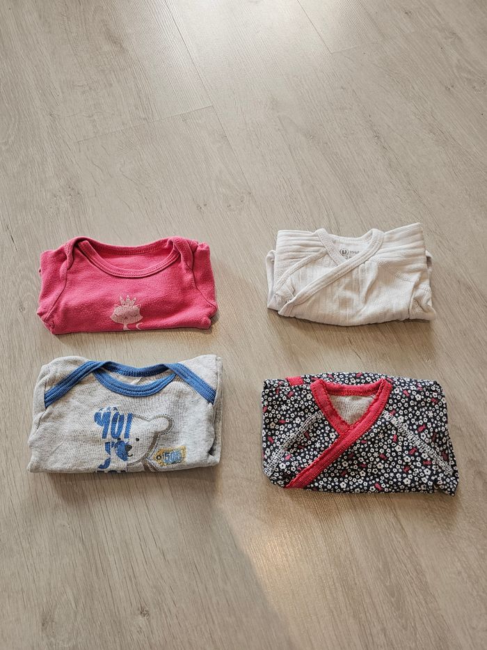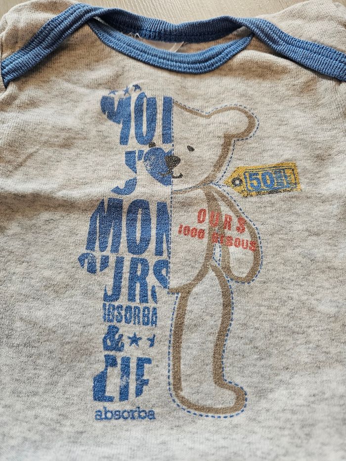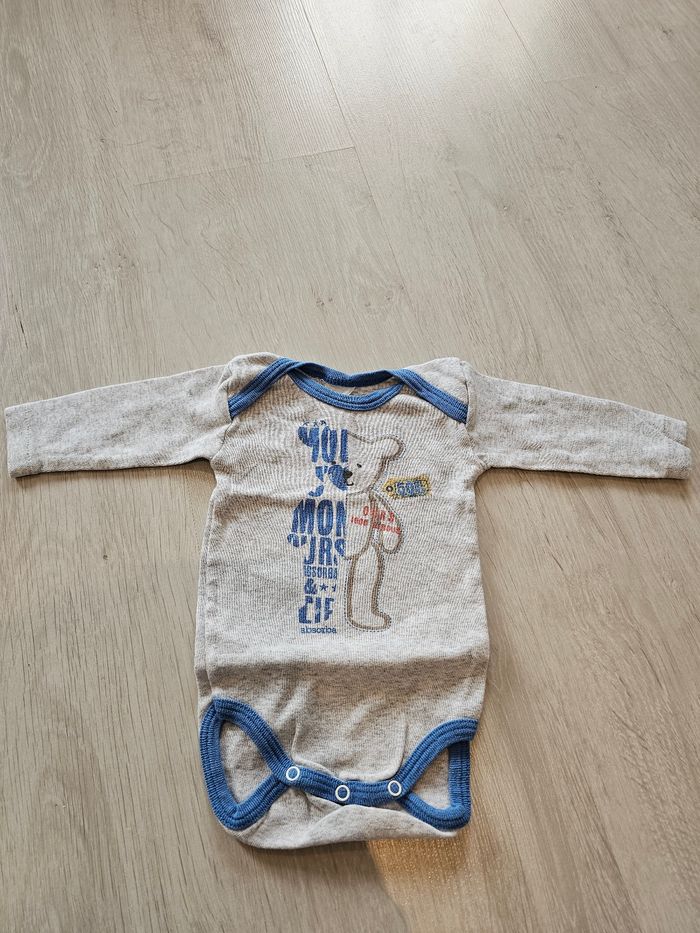 Lot de 4 bodys en bon état. 2 ouvertures sur l'avant 2 classiques Le gris avec l'ours est un Absorba. Taille 3 mois