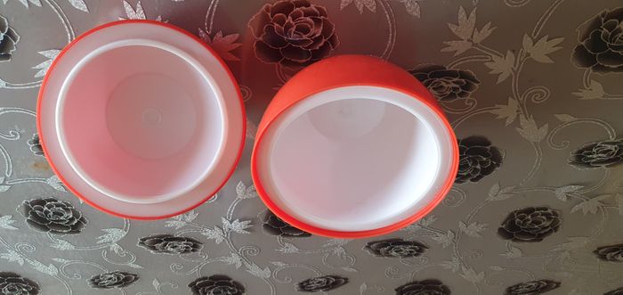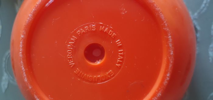 Très bel objet collector pour les amateurs de vintage, originale boîte à glaçons isotherme des années 70 en excellent état de conservation, forme fruit (tomate, orange, fraise?) fabriquée en Italy en exclusivité pour Veropam Paris, coloris orange, intérieur blanc, hauteur du bol 10cms, diamètre 15cms, hauteur totale 18cms.
