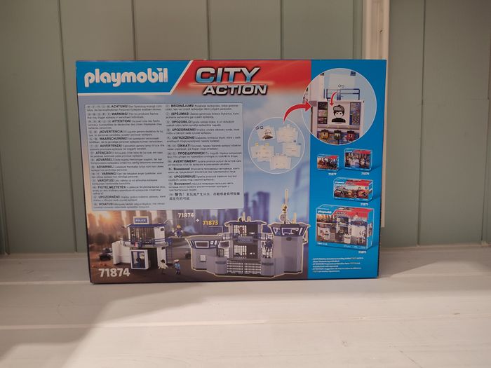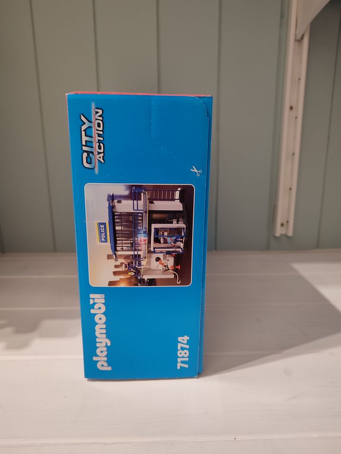 produit dans sa boite d'origine scellé 71874 Playmobil city action envoi rapide et soigné Ce set comprend : 1 policier, 1 policière, 1 malfaiteur; Accessoires : 1 poste de police, 1 table, 1 boîte transparente avec couvercle, 1 mur des délinquants, 1 caméra, 1 lit avec matelas, 1 table, 1 chaise, 1 assiette, 1 gobelet, 1 cuillère, 1 brosse à dents avec dentifrice, 1 lavabo, 1 miroir, 1 toilette, 2 casquettes de police, 1 fusil, 2 pistolets, 1 trousseau de clés, 1 mur des recherches avec 15 feuilles transparentes, 2 cônes de circulation