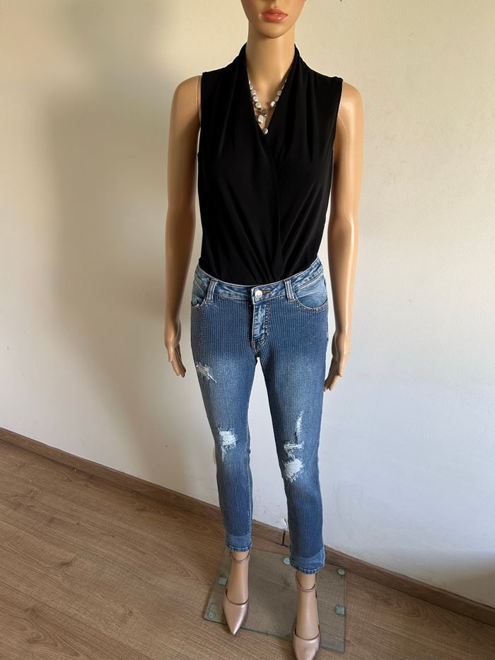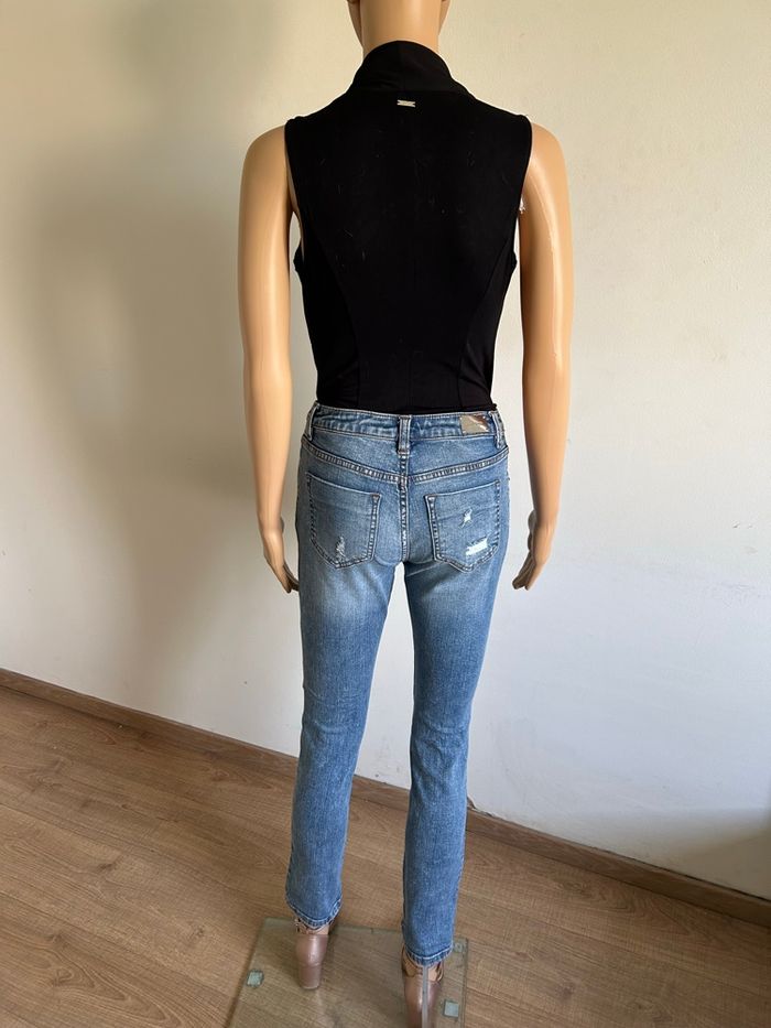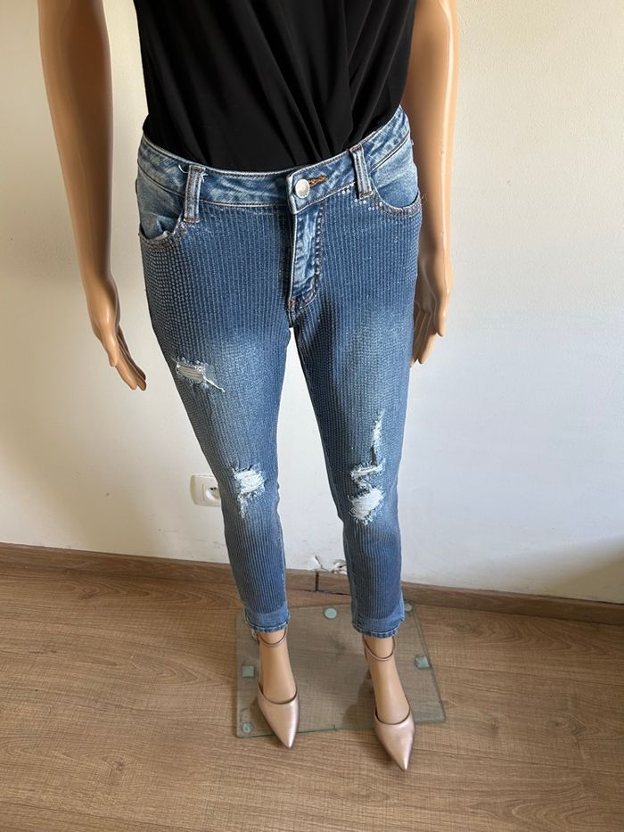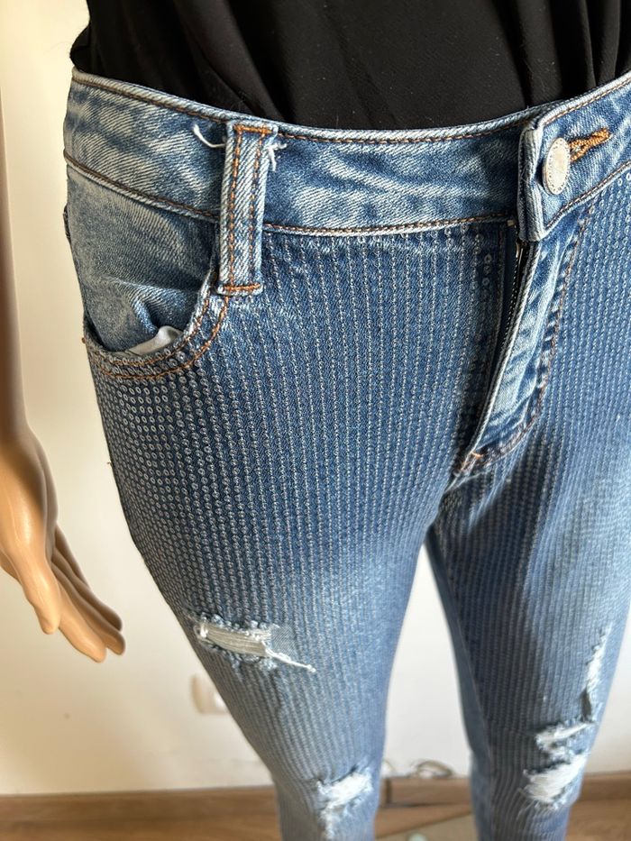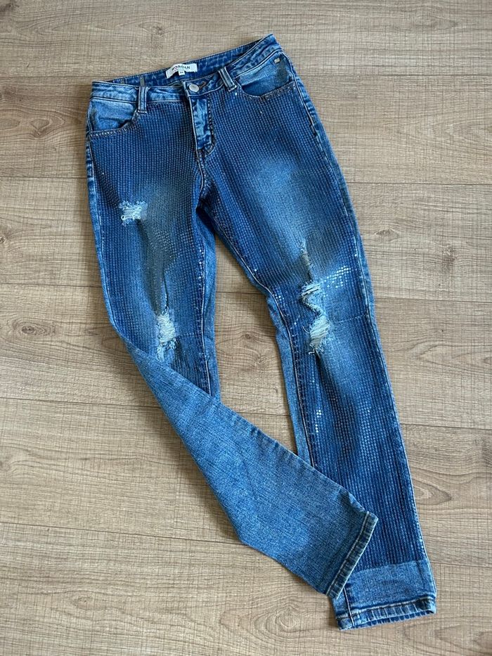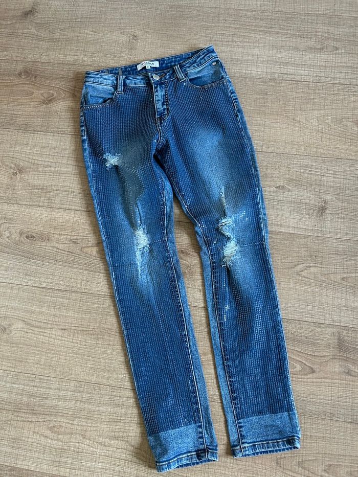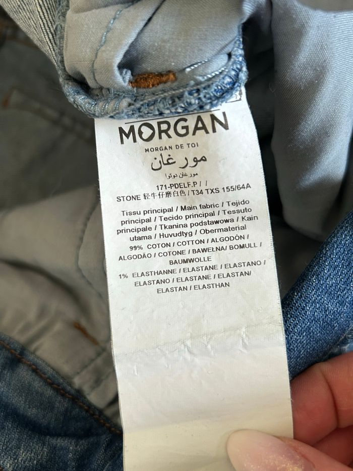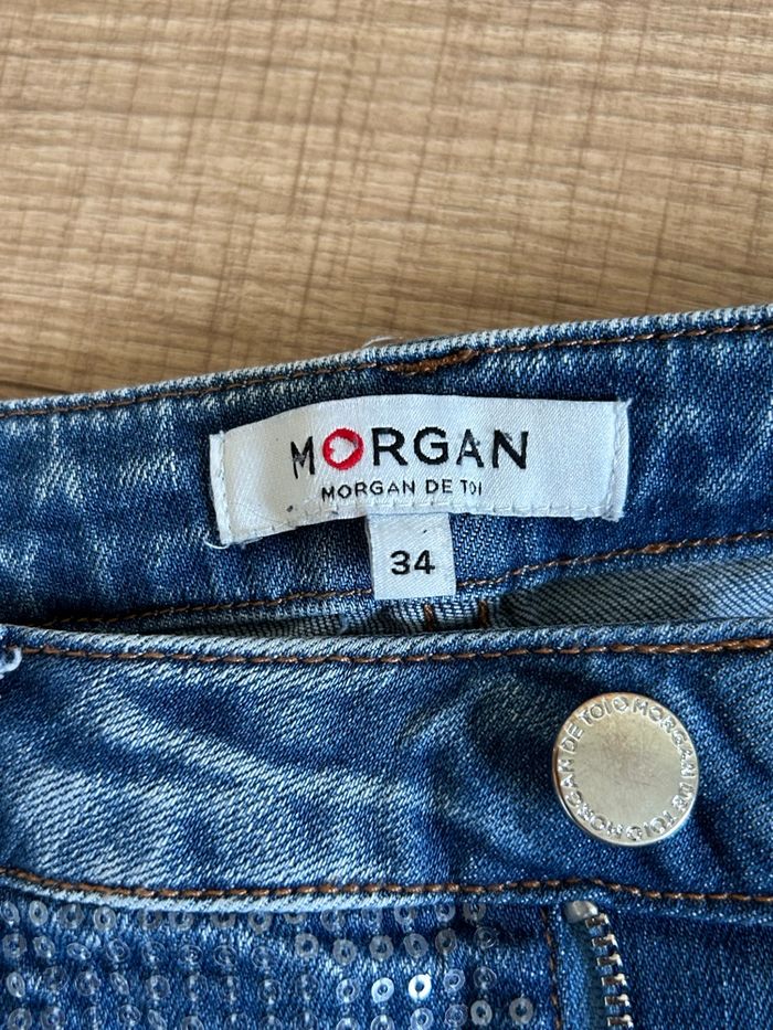 Magnifique jean bleu avec sequins, de marque Morgan. Taille 34. Jamais porté, état neuf. taille 34 cms longueur 93 cms longueur entrejambes 69 cms 99% coton et 1% elasthanne