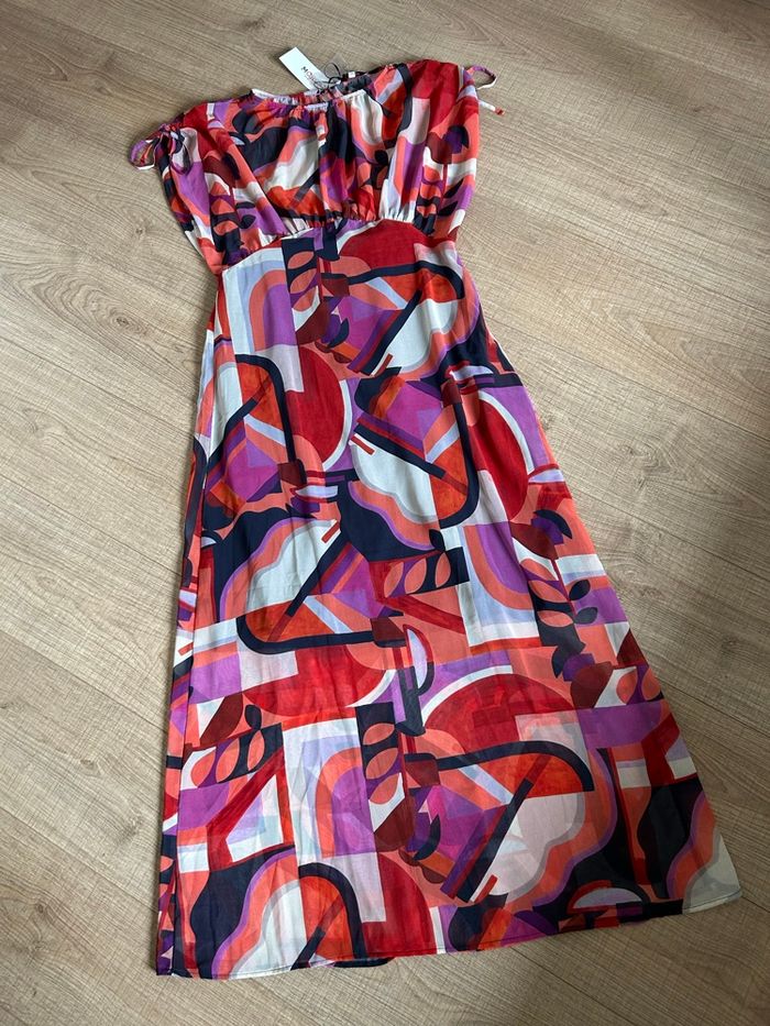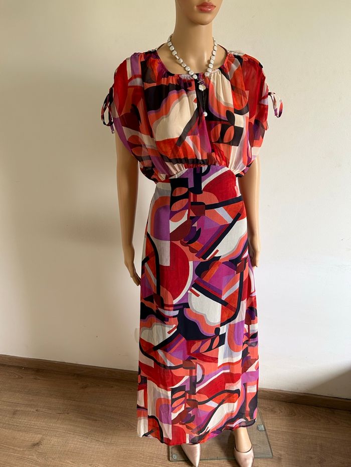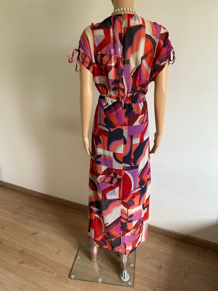 Jolie robe longue imprimée multicolore à manches courtes, de marque Morgan. Taille 40. Elle est neuve avec étiquette (valeur 95€). aisselle à aisselle 52 cms taille 40 cms et plus longueur depuis épaule environ 140 cms La taille est extensible 100% polyester